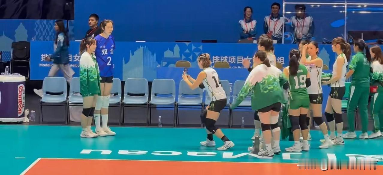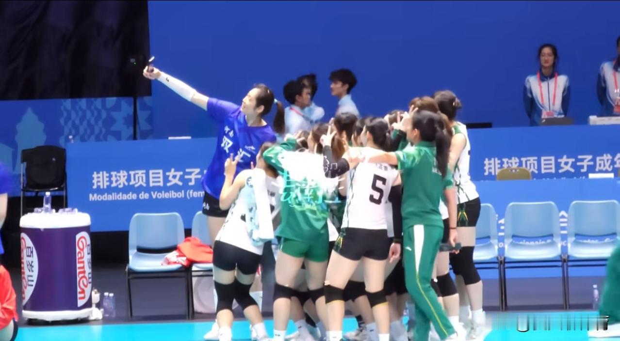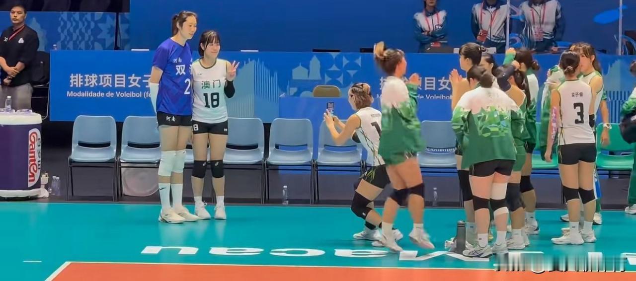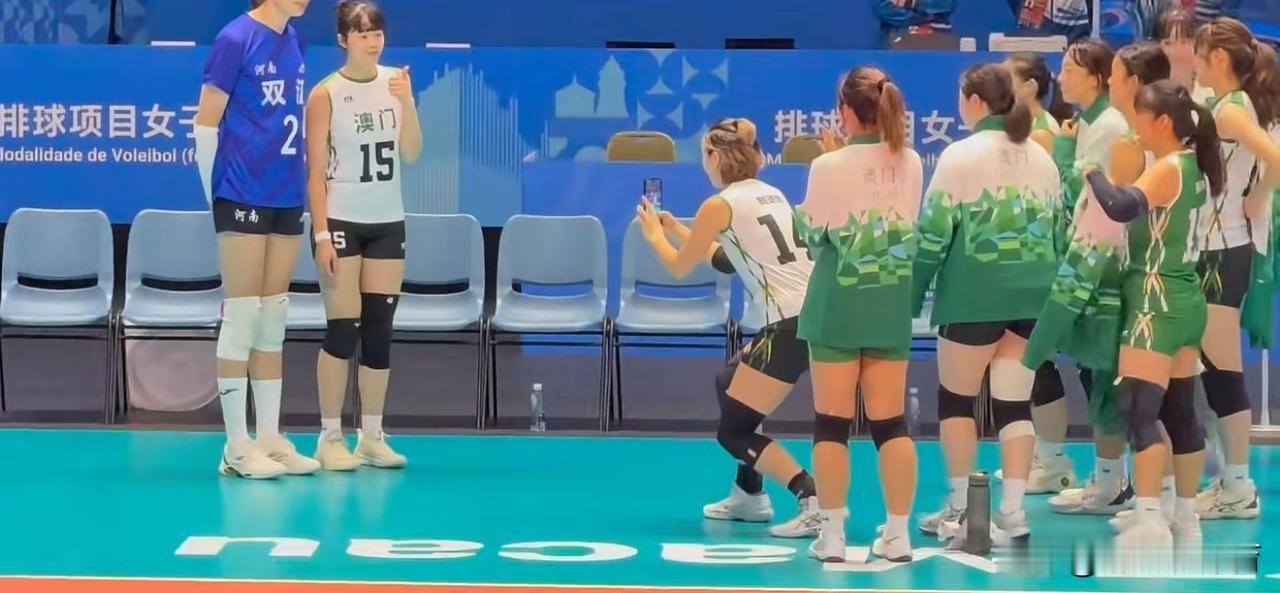 全运会5A活动景点打卡点又来了!感觉澳门女排今天有点无心应战,只想赶紧结束去找朱婷合影拍照!朱婷为了满足她们的愿望,拿起手机干脆和她们一块拍合影,澳门队的工作人员看到了,马上飞奔到朱婷这边要合照!拍不完根本拍不完,拿到朱婷合照的队员开心地蹦了起来,毕竟这可是千载难逢的好机会啊!朱婷也是格外有耐心,一个一个来合照!