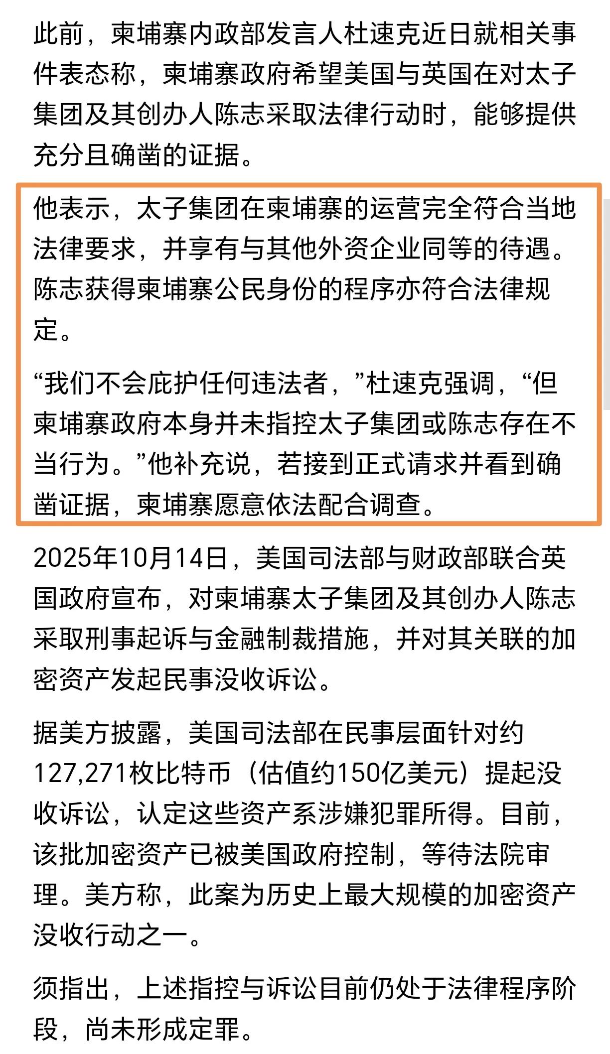 即使是到了现在,柬埔寨太子集团还在否认违法犯罪行为的指控。 如果真的没有问题,那就让陈志公开亮相出来解释一下吧。 现在世界各国都在查封太子集团资产,也就柬埔寨政府还在硬着头皮说太子集团合法合规、没有任何违法犯罪行为,还在为陈志说话。 柬埔寨政府的问题,实在太明显了,所以现在柬埔寨当局无论说自己有多么清白、无辜、严格执法、打击电诈……在外界看来,通通都是谎言。 太子集团