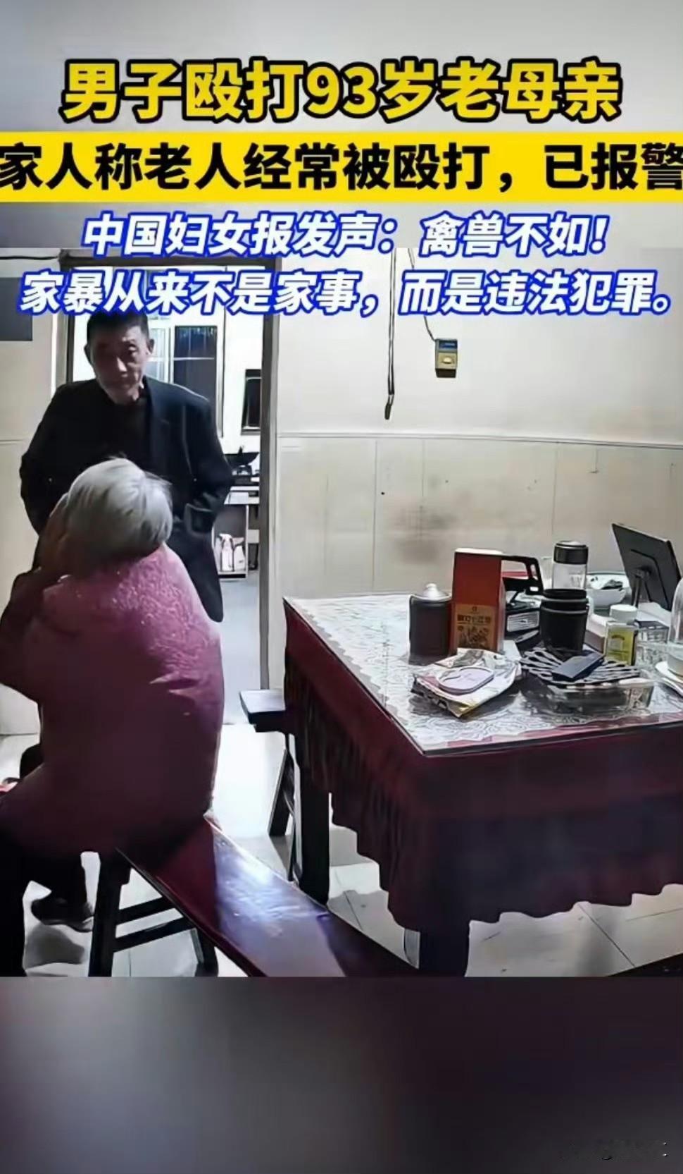 2025年11月10日,江苏常州武进区嘉泽镇男子杨某中因琐事与93岁母亲陈某琴发生口角,随后对老人实施持续殴打:多次扇耳光、拽头发,并将老人拖入厨房按倒在地施暴。监控视频清晰记录老人哀嚎躲避的画面,亲属称此类虐待行为长期存在。 警方行动:当日18时16分接到报警后,民警赶赴现场控制杨某中,目前其已被刑事拘留,案件正以涉嫌虐待罪或故意伤害罪侦办。若伤情鉴定达轻伤以上,量刑可能加重至最高7年。 老人安置:嘉泽镇妇联、派出所派专人上门提供生活保障和心理支持,确保老人需求即时响应。 舆论谴责与伦理批判:突破人伦底线! 全网谴责施暴者“禽兽不如”,对高龄至亲施暴严重践踏孝道传统。 冲击“养儿防老”观念:事件暴露部分家庭将老人视为负担的扭曲价值观,引发公众对传统养老模式的反思。 执法与制度短板:干预迟滞质疑! 舆论质疑为何需舆论曝光才推动立案,呼吁基层主动排查隐蔽性家暴。 法律执行难点:家暴案件常因“家丑不外扬”或亲属谅解而轻判,需强化司法主动介入。 法律层面:提高虐待老人量刑标准,建立涉老案件快速响应机制。 社会层面:构建“社区-妇联-警方”联动网络,将反家暴纳入基层考核。推广“AI监控加一键呼叫”系统,强化独居老人安全防护。 文化与教育:强化孝道法律义务宣传,扭转将老人物化的观念;鼓励多子女家庭互相监督赡养责任。 正如网友所言:“孝道不应是暴力的遮羞布,严惩施暴者才能守住亲情底线。” 唯有法律亮剑、社区织网、全民觉醒,方能守护“老有所安”的尊严。 不孝子被抓当然大快人心,但也有很多人担心老人后续无人照顾,或是遭受更严重的虐待,她未来的生活照料、医疗保障、安全防护等问题仍需系统解决。妇联、派出所已派专人上门服务,这是良好的开端,但后续更需建立长效机制,将老人纳入重点关注和援助的范围,明确专人定期回访,协调社区、养老机构等多方资源,建立邻里互助网络,让老人在遇到困难时能及时得到帮助,确保老人在生活上有人照料、安全上有人守护。