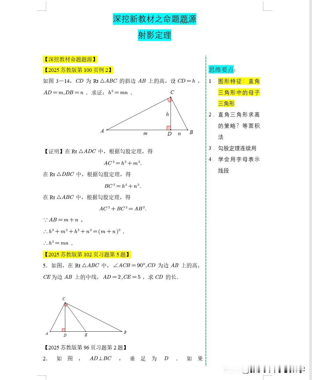 江苏南京鼓楼区八年级四校联考第23题,13题均被押中,深挖教材太重要了上周考前,针对八年级期中考前复习,讲解了深挖教材四个经典结论:其中就有这道题。 我给它形象拓展为射影定理,当时拓展了三个结论。 同时采用了不同的方法进行了证明。 很巧的是这次江苏南京鼓楼区四校统考全部押中,第13题和第23题。 所以新中考模式下回归教材,深挖教材才是王道!南京期中 江宁期中 南京期中考 八年级四项考试 南京初二年级考 南京八年级 南京期中真题