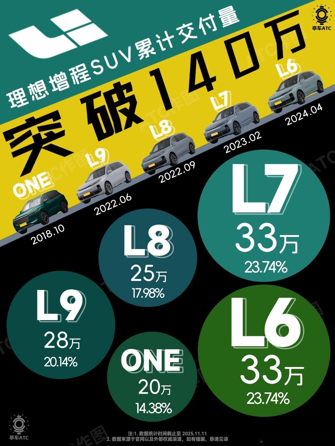 还得是我想子!作为增程SUV的开创者,理想在这个品类的累计交付,已经干到了140万+,这个数字即便放在整个新势力车圈里,依旧是友商高山仰止般的存在。回头看,自2018年理想ONE开路,到作为当时国产全尺寸SUV代表的理想L9,在当时的高端市场杀出一片天!再到L8、L7、L6有计划、有节奏的下沉,多款产品协调布局,齐头并进,成功地将理想的品牌 Slogan——「移动的家,幸福的家」牢牢跟家庭用车进行捆绑,并深深根植于国人心中。而更有意思的是,理想的销量结构分布,不信奉车海战术,而是集中精力,把每一款车型都做成同级的超级单品!具体到实际数据上看:︎●L6 和L7各占有33万,占比接近四分之一,说明理想在30万级主流家庭市场上站稳了脚跟;︎●L8 的25万台和 L9的28万台也很能说明问题——高净值人群对理想的认可度相当高;︎●至于ONE的那20万台,则可以看作是理想增程家族的技术和市场验证起点,更重要的历史意义在于,打响品牌名气,进入大众视野;这一串数字背后,不只是销量,更是一种用户信任的延续,可别忘了,当初的新能源赛道,可不像今天这么成熟,插混入场门槛高,纯电局成本居高不下,理想就是敢为天下先,率先 All in 增程,另辟蹊径,从而强势突围。而如今,这条路线不仅被市场反复验证,友商争相效仿,更被140万名用户用真金白银投了票,盖了章!光就这一点来说,理想就完全值得各位友商一个点赞。