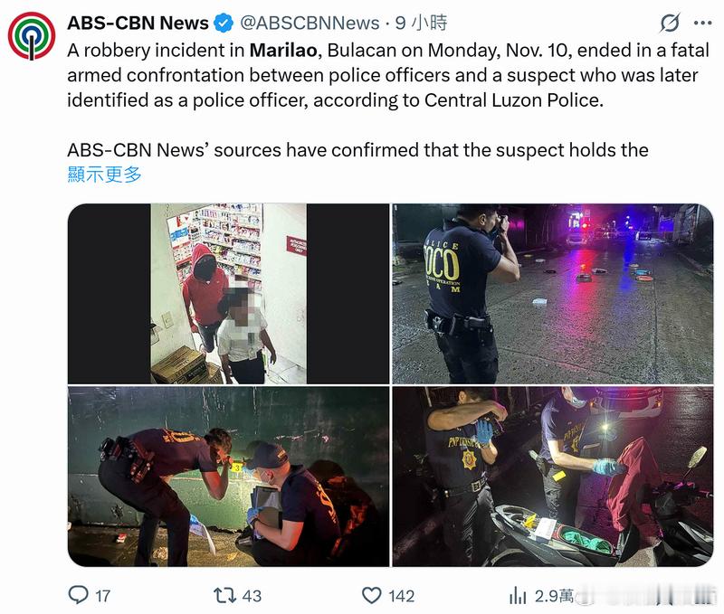 【菲律宾警察抢劫便利店引枪战,被同僚击毙】 菲律宾布拉坎省马瑞佬镇一家便利店10日晚发生抢劫案,一名警察行凶并在逃逸过程中与赶到现场的执法人员发生枪战,最终中弹身亡。菲律宾第3行政区警察局表示,警方接获报警后迅速派员前往现场。嫌犯在骑摩托车逃离时对追捕警员开枪,引发交火,被当场击毙。经搜查,嫌犯身上缴获疑似抢劫所得现金约2万披索(约2,416 元人民币)。第3行政区警察局长宾诺尼斯证实,嫌犯为警官,菲律宾媒体报道其系卡罗肯市北区警局刑事调查科科长。马瑞佬镇距卡罗肯市约20公里。宾诺尼斯强调,警方绝不袒护违法同僚,正在进一步调查案件动机。菲律宾民调显示,今年8月民众对警察信任度为71%,对执法满意度为73%,较往年明显改善。但警方内部仍存在少数害群之马,持续损害执法形象。今年7月,吕宋岛中部马巴拉卡市印刷店抢案中,5名歹徒中有2人为扫毒组警员;此外,今年已曝光的警察勒索案件至少3起,其中4月一宗涉及华商,涉案金额高达数千万披索,共有31名警员遭革职调查。图:菲律宾一名警察昨晚抢劫便利商店,与赶到现场的执法人员发生枪战,中弹身亡。 (图撷自X.com)