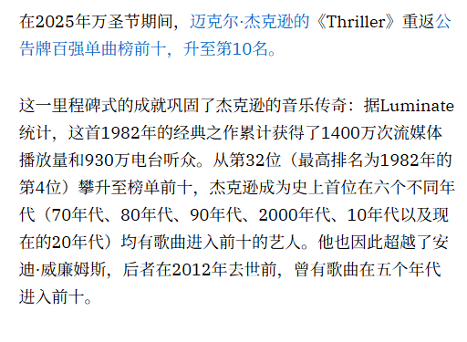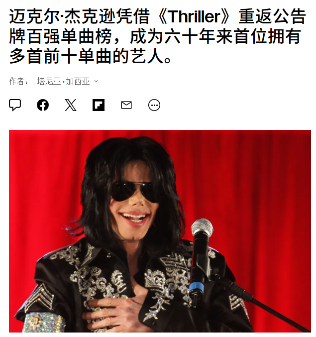 【】真正的传奇!据外媒,迈克尔·杰克逊的《Thriller》重返公告牌百强单曲榜前十,升至第10名。这一里程碑式的成就巩固了杰克逊的音乐传奇:据Luminate统计,这首1982年的经典之作累计获得了1400万次流媒体播放量和930万电台听众。从第32位(最高排名为1982年的第4位)攀升至榜单前十,杰克逊成为史上首位在六个不同年代(70年代、80年代、90年代、2000年代、10年代以及现在的20年代)均有歌曲进入前十的艺人。