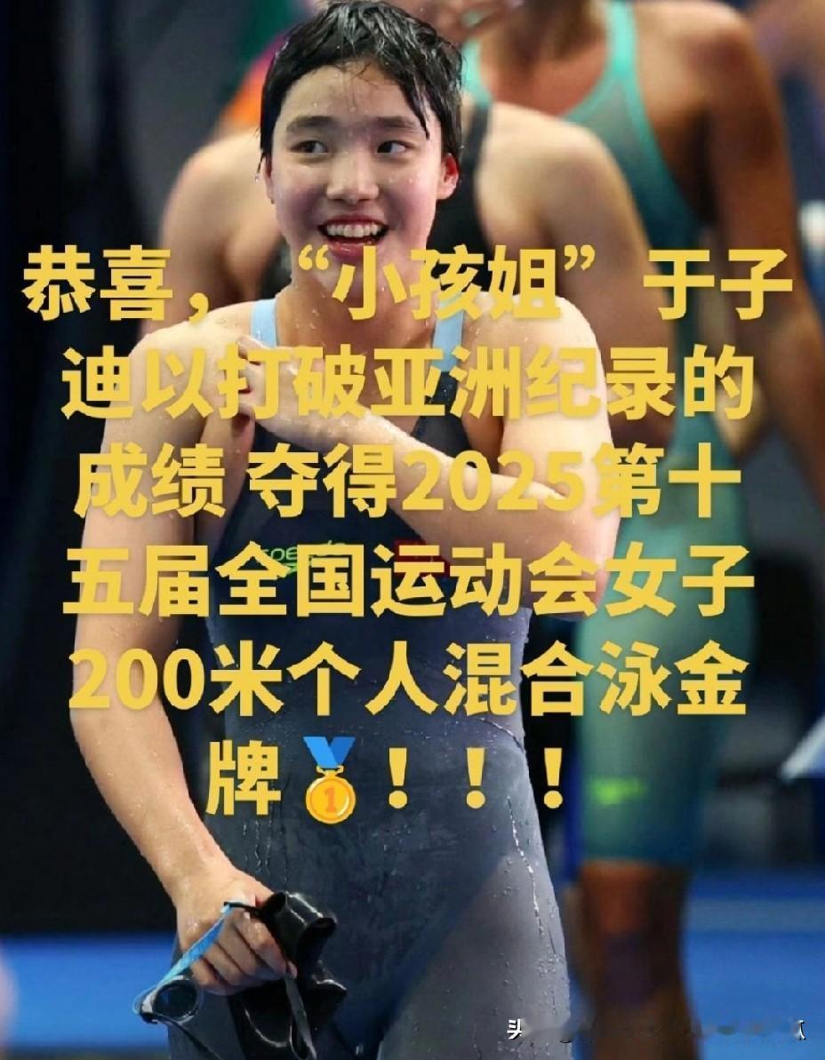 小孩姐于子迪真的太厉害了, 现在才13岁就已经破亚洲记录并夺得全运会金牌, 于子迪这两年的进步一直都很明显, 技术动作和一些小的瑕疵也在完善当中。 等到骨骼和肌肉更加成熟后速度还可以再涨一截, 到时候中国的短距离女子游泳就又有了扛大旗的人物。