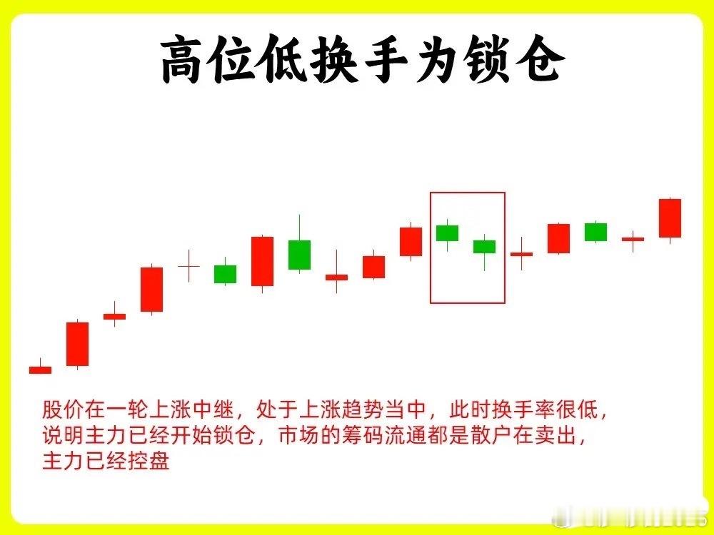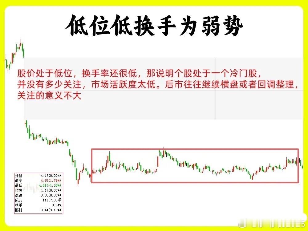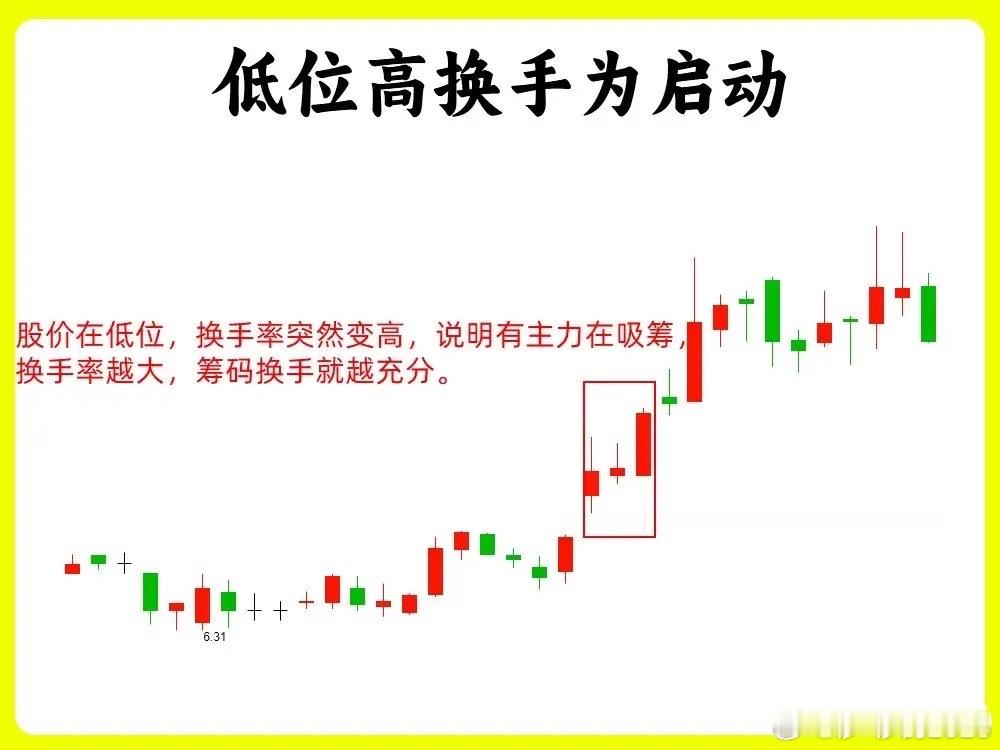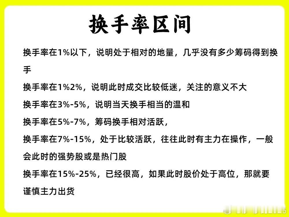 换手率的数值代表着什么呢?我们简单可以这样认为,个股的市值把他比做100%,那此时有5%的筹码今天被换手,那今天换手率就是5%,现在知道了把我们把换手率大小,来判断个股的强弱,我们可以分成六种换手率在1%以下,说明处于相对的地量,几乎没有多少筹码得到换手换手率在1%2%,说明此时成交比较低迷,关注的意义不大换手率在3%-5%,说明当天换手相当的温和换手率在5%-7%,筹码换手相对活跃,换手率在7%-15%,处于比较活跃,往往此时有主力在操作,一般会此时的强势股或是热门股换手率在15%-25%,已经很高,如果此时股价处于高位,那就要谨慎主力出货一、低位低换手为弱势股价处于低位,换手率还很低,那说明个股处于一个冷门股,并没有多少关注,市场活跃度太低。后市往往继续横盘或者回调整理,关注的意义不大二、低位高换手为启动股价在低位,换手率突然变高,说明有主力在吸筹,换手率越大,筹码换手就越充分。三、高位低换手为锁仓股价在一轮上涨中继,处于上涨趋势当中,此时换手率很低,说明主力已经开始锁仓,市场的筹码流通都是散户在卖出,主力已经控盘四、高位高换手为出货股价经过长时间的上涨以后,处于一个高位,此时的换手率也很高,比如换手率大于20%,当然了大盘蓝筹和中小盘股的比值肯定是不同的,如果大蓝筹可能是15%,就算已经很高了。那就说明此时主力在出货,高位派发筹码
