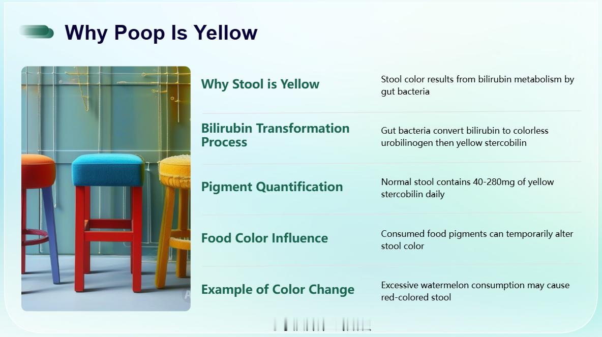 便便为啥是黄色的便便虽然恶心,但恐怕人人都免不了直视它,它的颜色通常是黄色的。有人产生了疑问:为什么便便都是黄黄的呢?这个问题有些不雅,但却非常有趣。能够解答这个问题的人绝对拥有吹牛的“资本”。便便是人体的代谢物,它的颜色自然与人体的新陈代谢有关系。我们吃下去的食物会在消化道中遇到体内产生的各种物质,其中有一种物质叫做葡糖醛酸胆红素,它其实是人体内的一种代谢物,其会随着胆汁到达肠道。这种物质在回肠末端至结肠部位的肠菌作用下,大部分会脱去葡糖醛酸基生成胆红素,紧接着它们会被逐步还原为无色的胆素原。在肠道的下段,这些无色的胆素原接触空气后会被氧化为胆素。胆素就是棕黄色的,而它又是便便中的主要色素(正常人每日排出总量为40毫克—280毫克)。这就是便便是黄色的原因。然而,便便的颜色有时也会出现意外情况。人们吃的食物色素比较多时,便便就会呈现与所吃的食物色素相一致的颜色。例如,当我们吃了大量的西瓜后,便便的颜色就会呈现红色。 ||