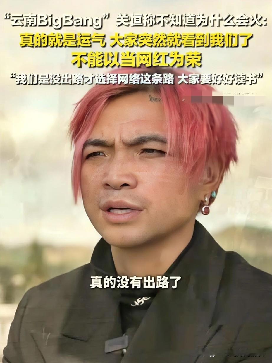 看过云南bigbang的直播, 以为是一群不学无术的人,毫无营养的表演, 今天直接被这哥们儿的几句话路转粉了。 红了不仅说是运气,是“真的没有出路了”还劝告大家“不以这个为荣,还是要多读书” 而且不卖惨,另外一段采访问小时候苦吗?答:不苦,这样的人很难得。 没有高学历,但是这五兄弟的格局,三观都超级正。 每天上午9点10分准时开播,复刻舞台一小时,下播就回地里干活,又专业又实在,不像那些虚头巴脑的,看着就亲切。 7天涨粉72万,直播时几十万人挤着看,本地品牌方都抢着打榜。 你说现在网红这么多,咋就他们能火?不就因为真实又努力吗?
