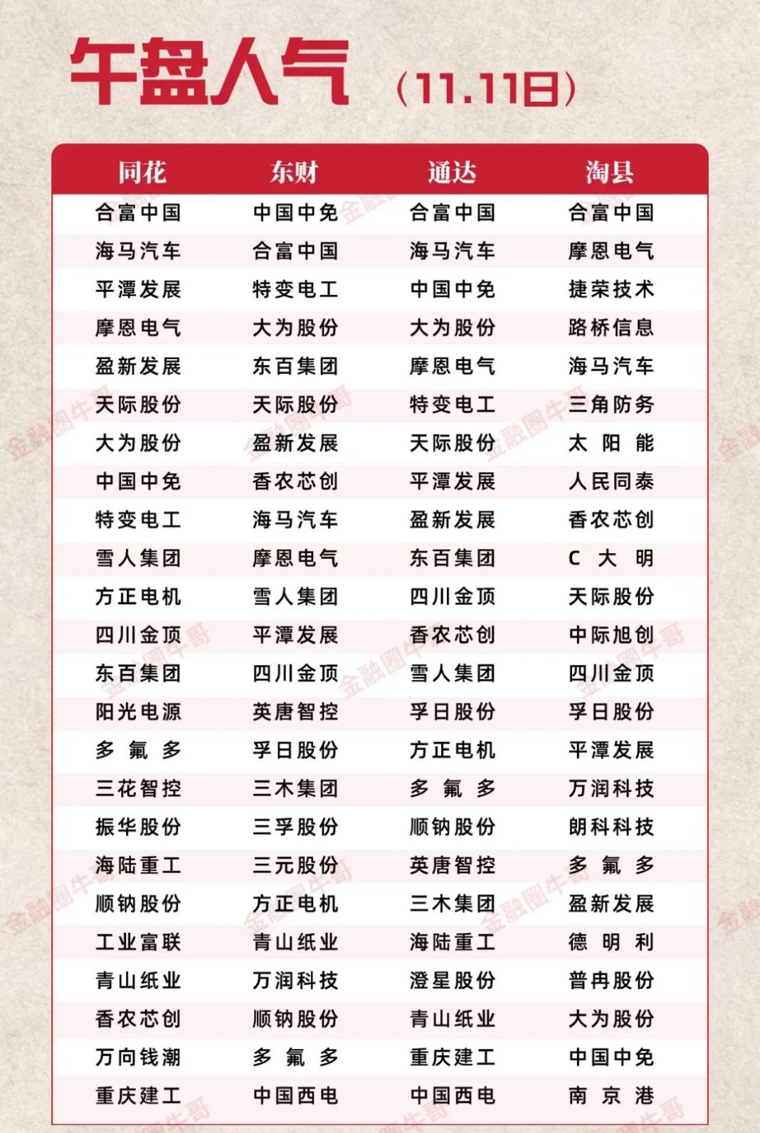 11月11日人气榜前三出炉:合富中国、海马汽车、摩恩电气领跑市场11月11日A股人气风向标明确,合富中国、海马汽车、摩恩电气强势跻身人气榜单前三,成为当日市场资金聚焦的核心标的。合富中国稳居人气榜首,凭借医药商业、两岸医疗等多概念共振,叠加近期板块热度与题材催化,持续吸引资金扎堆,市场关注度居高不下;海马汽车作为“马”字辈主题核心标的,叠加海南自贸、氢能源等多重属性,在主题炒作热潮中脱颖而出,人气快速攀升;摩恩电气则依托智能电网+光伏电缆的赛道逻辑,受益于新型电力系统建设需求,近期连板走势亮眼,成为电力设备领域的人气标杆。