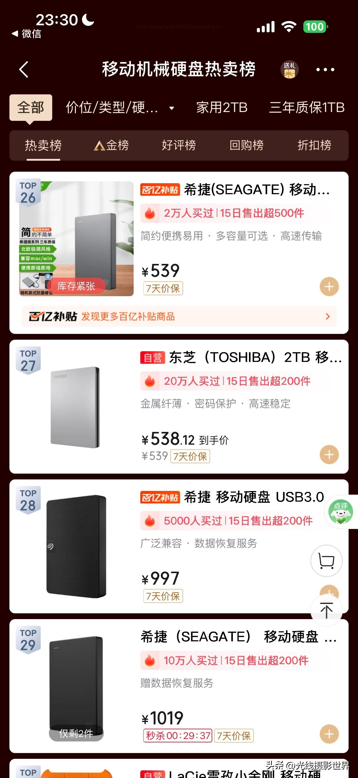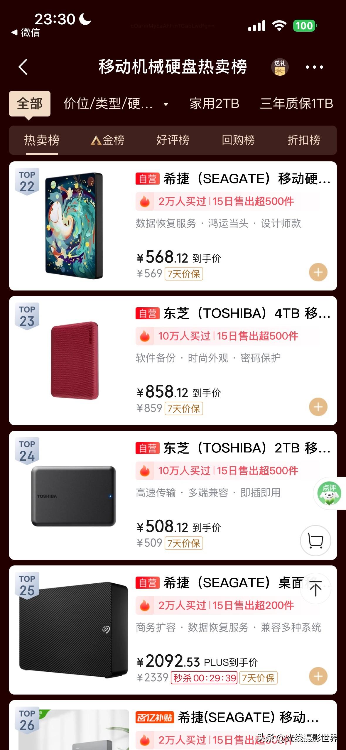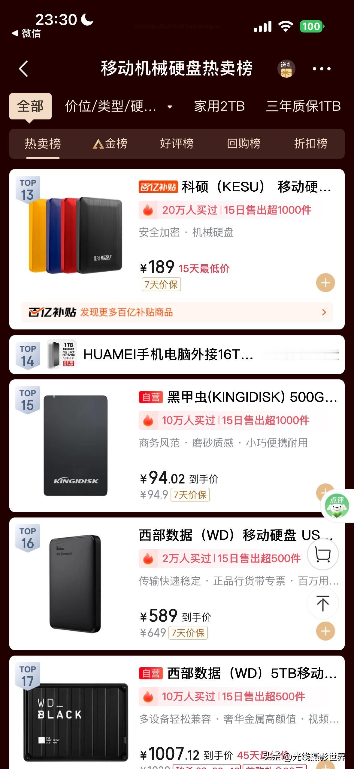 最近,内存,固态硬盘,机械硬盘,全部都在疯狂大涨价!但是,好像唯独2.5英寸的机械硬盘,没怎么涨价吧?!2025年11月11日深夜,我看了看移动机械硬盘销量排行榜,销量冠军,西部数据的5TB移动硬盘,977块钱……这个价格,好像基本没怎么变化?! 嗯,2TB的西部数据移动硬盘,也要607块钱! 所以,导致5TB的这个西部数据移动硬盘,性价比真的拉爆了啊! 还好还好……光线摄影世界曾兰谈天说地