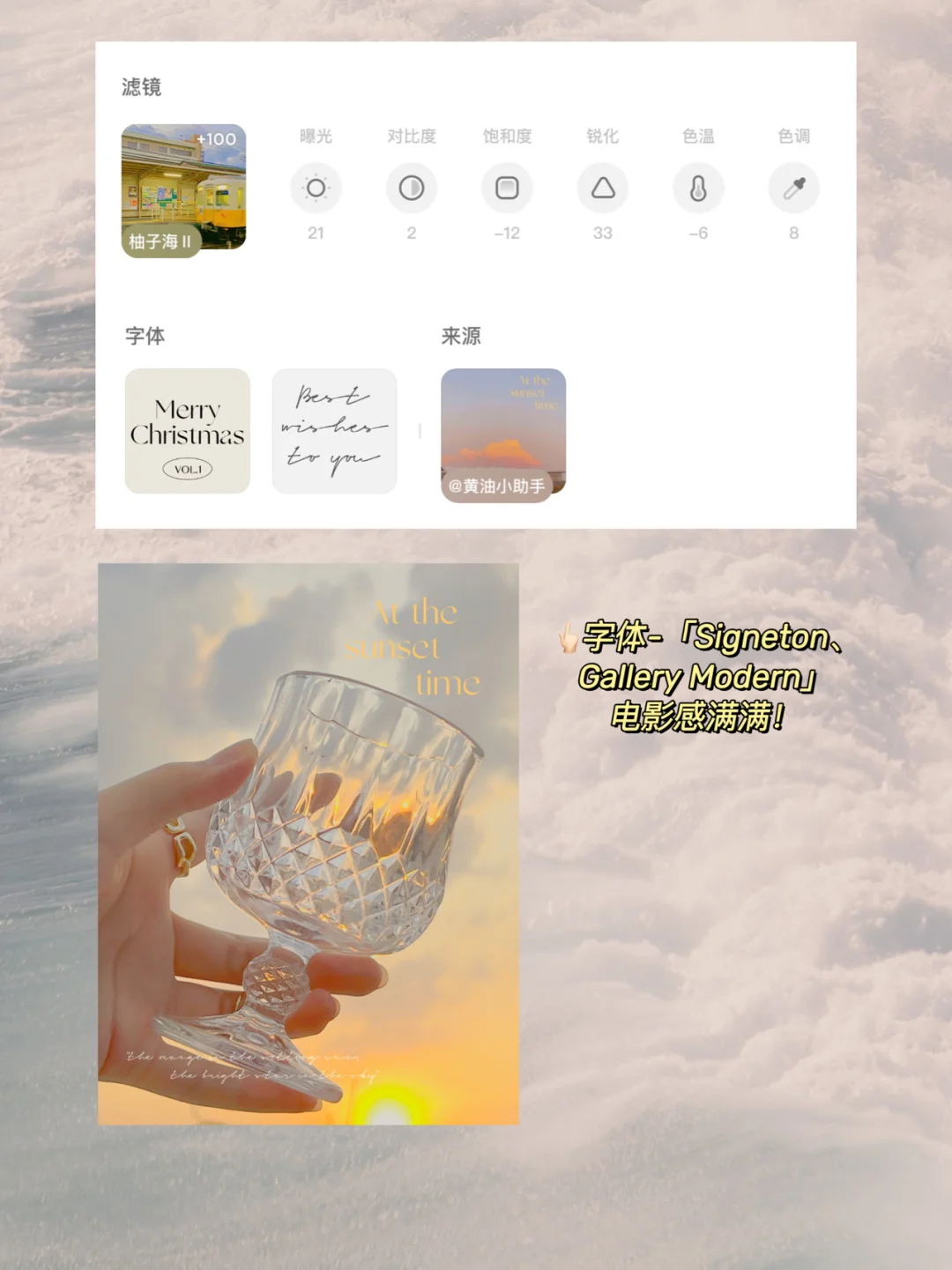 ✨日落太好拍了!手拿玻璃的杯子出来的效果太好看,后期裁图一下,电影感满满! . 💻 后期修图教程 黄油相机 滤镜:柚子海Ⅱ+100 曝光+21 对比度+2 饱和度-12 锐化+33 色温-6 色调+8 . 字体:Gallery Modern、Signeton 模板:「海报写真」模板分类 . 手机调色|调色教程|黄油滤镜调色|调色软件 | 滤镜调色教程| 拯救废片 | 手机拍照 | 手机摄影 喜欢我的分享记得👍🏻|⭐收藏|关注哦 我们下一期再见!🤍