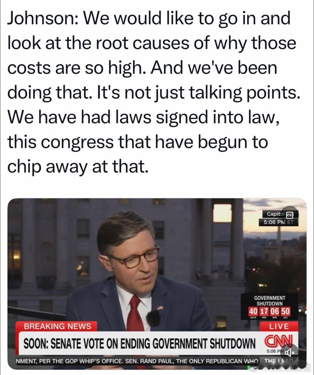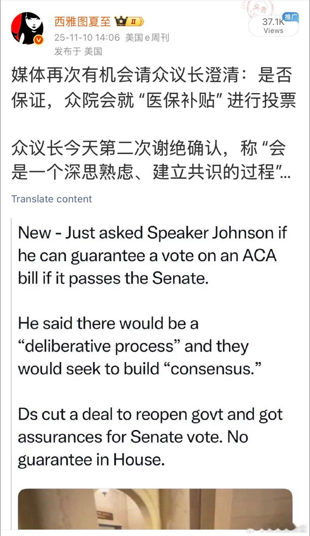 众议长,昨天有三次机会,公开澄清:“医保补贴再续一年”是否能在众院得到表决机会他都没有承诺“会投票”Biden时期增加的医保补贴年底到期、明年奥巴马医保的自付额大涨,已是定局
