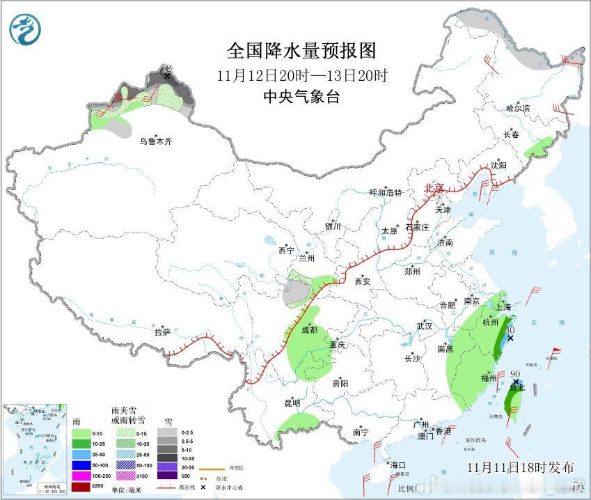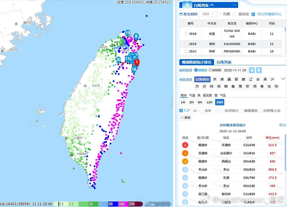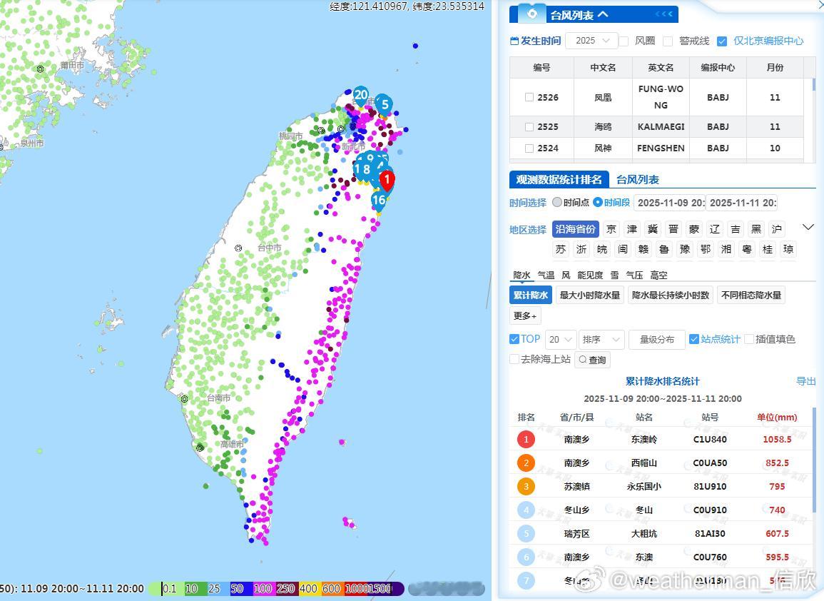 【强降水】昨晚到今天,我国大陆地区降水弱,湖南南岳10.3毫米,排名第一。因为台风凤凰影响,台湾岛东部出现特大暴雨。宜兰县南澳乡的东澳岭24小时雨量高达815.5毫米,从9日20时-11日20时,48小时雨量1058.5毫米。秋台风+冷空气+地形抬升,导致降雨量轻松突破1000毫米。2天雨量堪比北方很多城市2年的降水量。今晚到明天,台湾东部和南部的强降雨还会继续,还有暴雨或大暴雨(100-190毫米)。从过往两天对照看,实际降雨可能还会超预期。此外浙江东部、福建东南部,因为台风北侧倒槽影响,也可能出现大雨-暴雨。后天随着台风减弱、远离,台湾福建浙江的降雨会减弱。14日台风降雨彻底结束。不过13-14日会有冷空气影响新疆北部,导致阿勒泰、塔城等地出现明显降雪。15-16日冷空气继续东移,并且在高空形成冷涡,导致内蒙古东北部、黑龙江北部和东部、吉林东部等地也可能出现降雪。