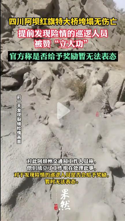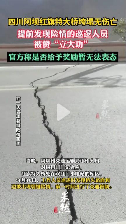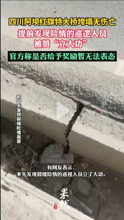 四川阿坝红旗特大桥属于国道317线上,日常来往的车辆非常多。如果不是提前一天发现险情,立即交通管制控制车辆前行,大桥突然倒塌后果不堪设想!发现险情的工作人员确实立了大功!但具体要不要表彰和如何表彰,大桥管理部门肯定有一套规定,必须要按照规定实施。从职责上来说,发现险情是巡查人员的职务要求,如果巡查没发现险情最后出事反而要受处理了;但从鼓励员工更好履职上来说,对发现特大险情的人进行奖励,也能起到很多的激励效果。还有一个情况,就是看发现险情的员工是不是在干本职工作,如果是其他工种的人额外发现了险情,那就肯定要奖励了。
