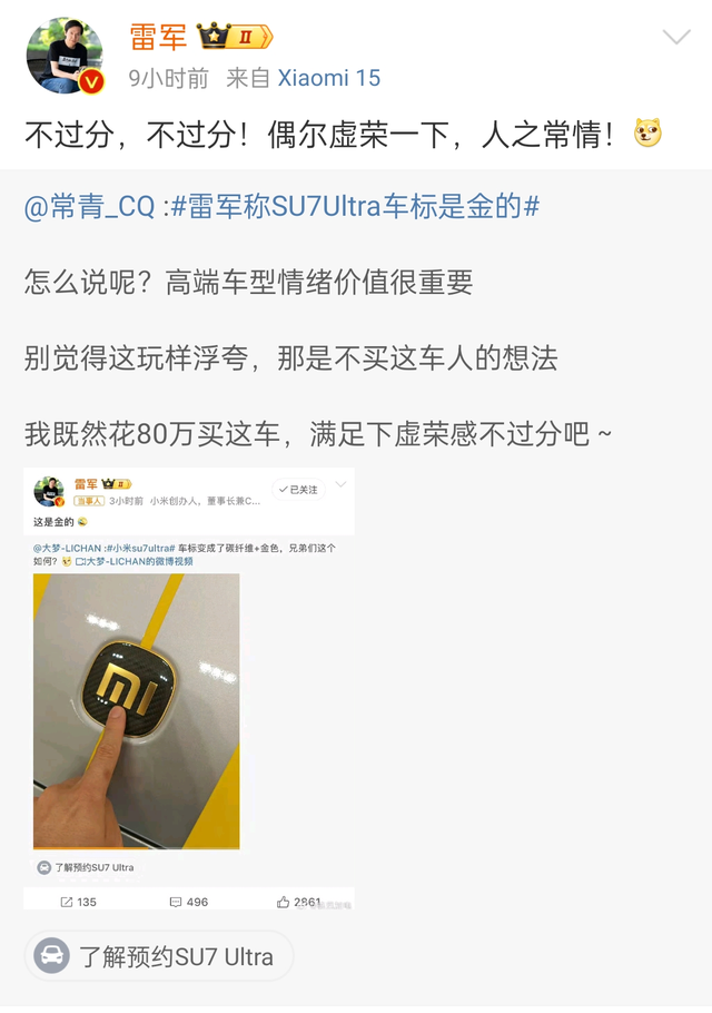 金标小米SU7 Ultra 纽北赛道成绩,估计大家都看到了,热度是相当高的。其原型车搭载三电机四驱系统,最大功率1584马力,零百加速1.97秒,最高车速超过350km/h。 性能肯定是比较强悍的,酷,可玩性也比较高。80万元左右的售价,雷总定下的销量目标是1万辆,差不多每月800多台。 差不多价位的保时捷718,全年销量大概2万多台。这么一对比,小米SU7 Ultra的销量目标,是不是很靠谱?
