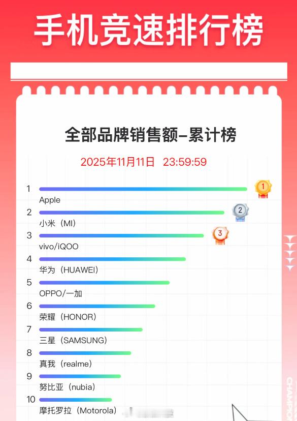 【】今年的双11正式落下帷幕,最终的手机品类战报也可以确定了。京东平台数据显示,截至11月11日23:59:59,苹果、小米、vivo位列销量榜前三,销售额榜单前三同样是苹果、小米、vivo。具体机型方面,全价格段总销量榜中,iPhone 17系列霸榜前三,REDMI K80是国产手机销量第一,位列第四;荣耀X70位列第五;REDMI Turbo 4 Pro第六。