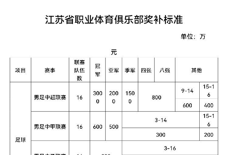 发奖啦!江苏三支中甲、两支中乙球队能申请多少省体育局奖补资金? 今年七月,江苏省体育局下发了《省体育局关于组织申报2026年度省体育事业发展专项资金(职业体育俱乐部发展)奖补资金的通知》,明确俱乐部根据上一赛季(2024赛季或联赛已结束的2024-2025赛季)参加的全国高级别职业联赛成绩申请奖补资金,包括中甲、中乙俱乐部均可根据成绩进行申请,那么三支中甲球队、两支中乙球队根据各自成绩各能申请多少呢? 1.南通支云,中甲排名第7: 2.苏州东吴,中甲排名第10; 4.无锡吴钩,中乙亚军;升入中甲; 5.南通珂缔缘,中乙第6;