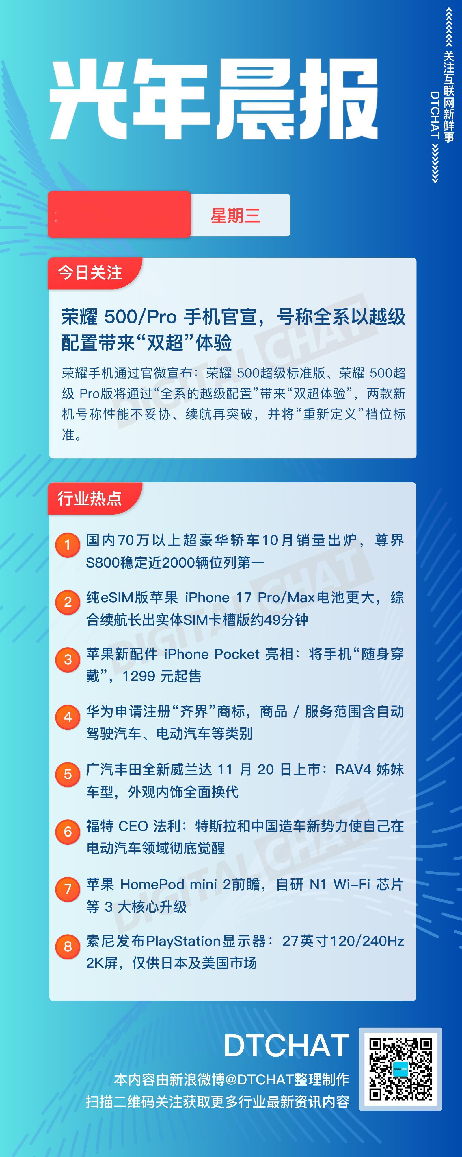 vol.873|11月12日:DTCHAT今日关注:荣耀 500/Pro 手机官宣,号称全系以越级配置带来“双超”体验