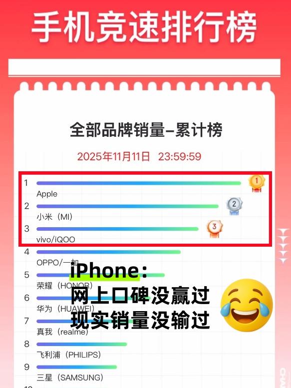 苹果还是那个苹果,iPhone手机真猛啊 双11手机销量榜单出来了 苹果、小米、vivo位列销量榜前三 只能说iPhone的网上口碑没赢过,现实销量没输过😂