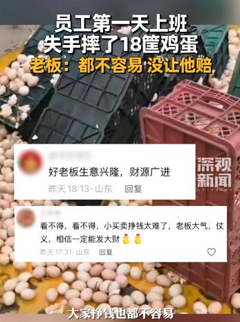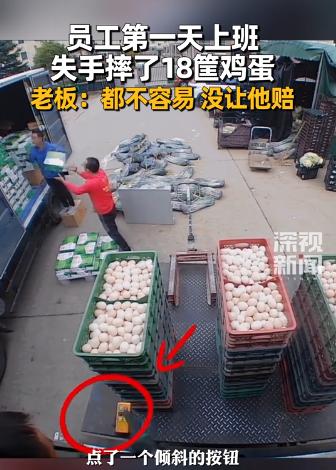 近日,山东威海一商铺,新员工第一天上班,因操作失误按错了按钮,点了一个倾斜的按钮,18箱鸡蛋箱都斜倒着下去了,箱子翻的翻,倒的倒,鸡蛋撒了一地,收拾起来可是个大工程…… 事情发生在威海一家商铺的超市卸货现场,宫女士分享的监控视频里,画面起初很平静。 几名工人忙着搬运货物,18筐鸡蛋整齐码放在货车尾板上,新入职的男员工拿着遥控器,准备操作尾板下降。 可就在按动按钮的瞬间,意外发生了,尾板没有平稳下降,反而突然倾斜,整排鸡蛋像坐滑梯似的顺着斜面滑落。 “哗啦啦”的碎裂声后,满地都是蛋液和破碎的蛋壳,场面一片狼藉。 该员工当时脸都白了,踉踉跄跄冲下货车,蹲在地上想捡又没法捡,急得手都在抖。 宫女士称这名员工虽然有类似工作经验,但第一天来自己店里上班,可能是太紧张,误把“下降”按钮按成了“倾斜”。 事发后不到一分钟,她就接到了员工的电话,电话里的声音带着明显的哭腔,一个劲地说“老板对不起,我赔,我一定赔”。 宫女士没等员工说完就打断了他,别慌,这不是故意的,谁还没个新手的时候?不用你赔,你先去下一个送货点,这边我来安排。 挂了电话,她立刻喊来3名员工,还联系了超市负责人说明情况。 让她没想到的是,超市员工听说后主动过来帮忙,附近路过的市民也拿起扫帚加入清理队伍,有人扫蛋壳,有人冲地面。 原本预计要两小时的活,大家齐心协力干到晚上7点半就结束了。 清理完现场,宫女士和员工一起清点损失:18筐鸡蛋总共540斤,最终只挑出2筐完好的,另外2筐半碎的鸡蛋被她送到了旁边的养殖场当饲料,避免浪费。 按市场价3.5元一斤算,这次意外损失了1680元,加上给超市补送18筐鸡蛋的成本,总损失接近2000元。 即便如此,当员工忙完送货回来再次提出赔偿时,宫女士还是摆了摆手,大家上班都不容易,又要装车又要开车,这点损失我承担得起。 在采访中,宫女士的话很实在,他不是故意的,第一天上班对设备不熟悉,紧张很正常。 要是让他赔,这笔钱可能是他大半个月的工资,以后干活只会缩手缩脚。 她的这份体谅,让员工格外感动,之后每次卸货都格外仔细,还主动承担了更多体力活,遇到其他新人操作设备时,还会主动上前提醒注意事项。 其实职场里的容错,从来不是对错误的纵容,而是给成长留有余地。 就像宫女士处理这件事时,不仅有“不追责”的善意,更有“减损失”的智慧。 补送鸡蛋保住超市合作,送碎鸡蛋给养殖场减少浪费,这些举动让一次意外没有变成经营危机。 反观有些老板,遇到新人失误就劈头盖脸指责,看似挽回了损失,实则逼得员工“怕犯错而不做事”,反而得不偿失。 更难得的是,这种包容会形成连锁反应,宫女士的员工后来成了团队里的“老带新”骨干,总会跟新人说“别怕错,咱们老板允许试错”。 超市负责人因为这件事,还主动给宫女士介绍了新的供货渠道。 就像网友说的,善意从来不会白费,你给员工兜底,员工就会给工作拼命。 职场从来不是“不犯错才合格”的考场,而是彼此支撑着成长的战场。 当新人敢在失误后说出“我错了”,当老板能说出“没关系”,这份信任与包容,才是团队最宝贵的财富。 就像那满地破碎的鸡蛋,看似是损失,却因为一份善意,孵化出了更牢固的职场情谊。
