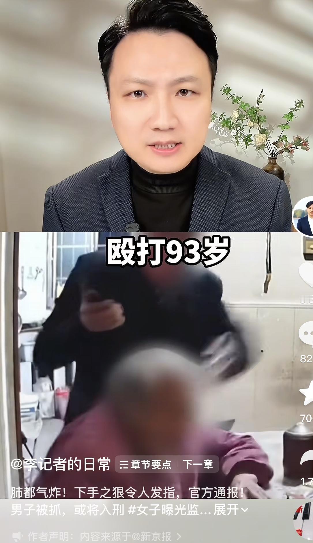 肺都气炸! 视频中一男子因为琐事和妈妈发生争执,连扇93岁母亲的耳光,母亲身形瘦弱,捂着耳朵,捂着脑袋! 可男子不依不饶,母亲逃到厨房,他将母亲摁在地上,继续殴打,母亲发着惨叫声! 这事发生在常州武进区一户人家,那是那家女儿从监控中看到的,而发出来的视频! 目前已经报警,那位男子根据情节会得到相应的惩罚! 都说养儿防老,孝顺,这位男子仅仅因为琐事对母亲大打出手让人大跌眼镜! 不管怎样,父母把你养育成人,不容易,太令人寒心了! 这样的儿子能靠他养老吗?
