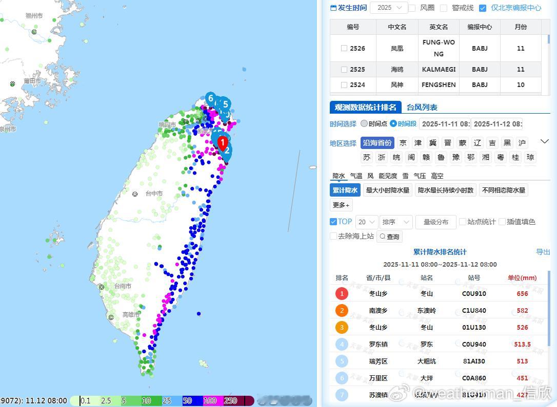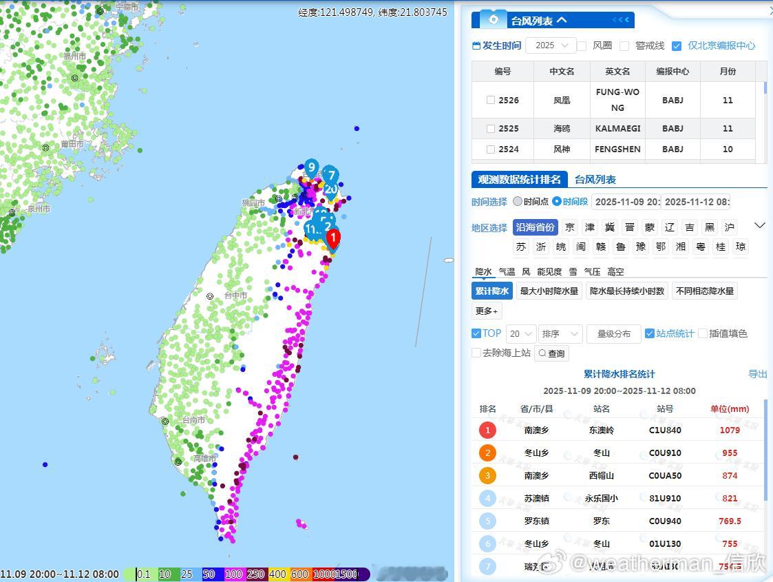 昨天到今晨,因为台风凤凰和冷空气的影响,浙江福建降雨增强,台湾东部强降雨持续,台