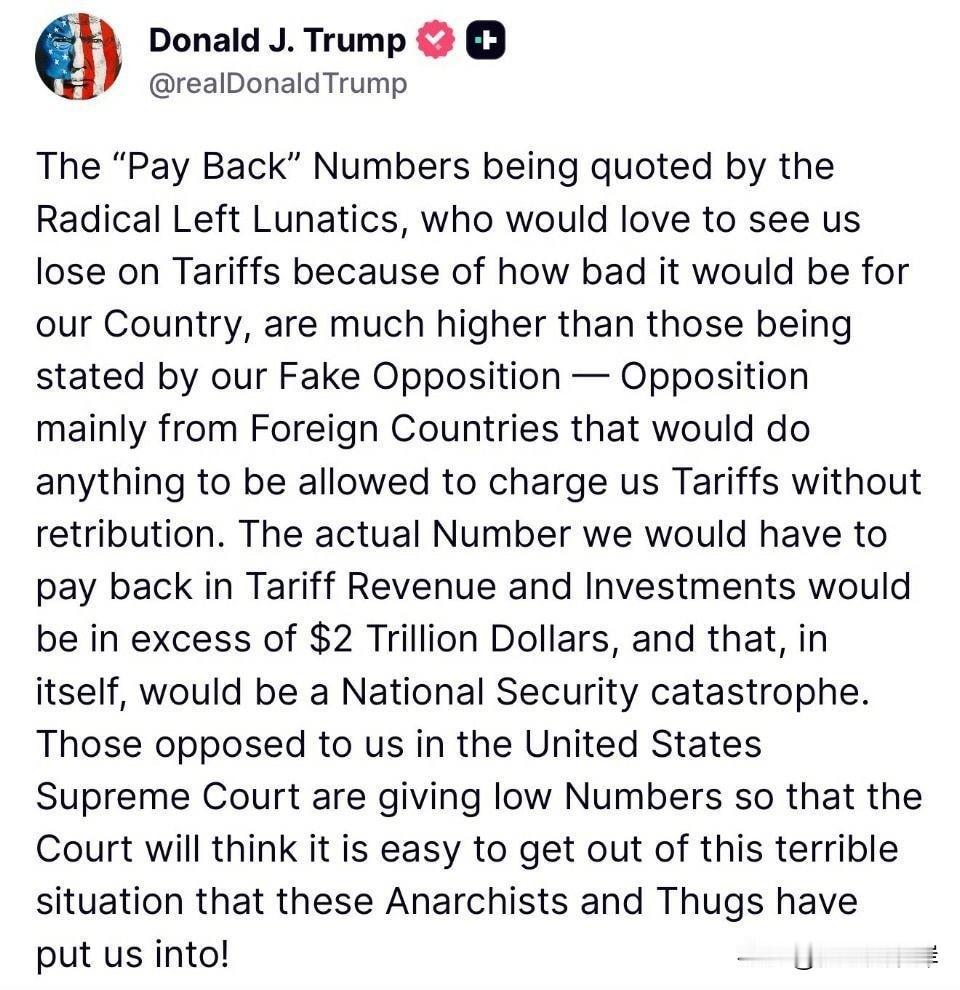 川普发文警告最高法院法官们,若推翻关税政策,美国将必须偿还超过2万亿美元。 “激进左翼疯子们引用的“偿还”数字,远高于我们虚假的反对者所声称的数字——这些反对主要来自那些愿意不惜一切代价对我们征收关税而不受报复的外国。他们希望我们输掉关税战,因为这将对我们的国家非常不利。我们实际上必须偿还的关税收入和投资总额将超过2万亿美元,这本身就将成为一场国家安全灾难。 那些在美国最高法院中反对我们的人,故意给出较低的估算数字,以便让法院认为摆脱这些无政府主义者和暴徒将我们置于的可怕困境是轻而易举的!”