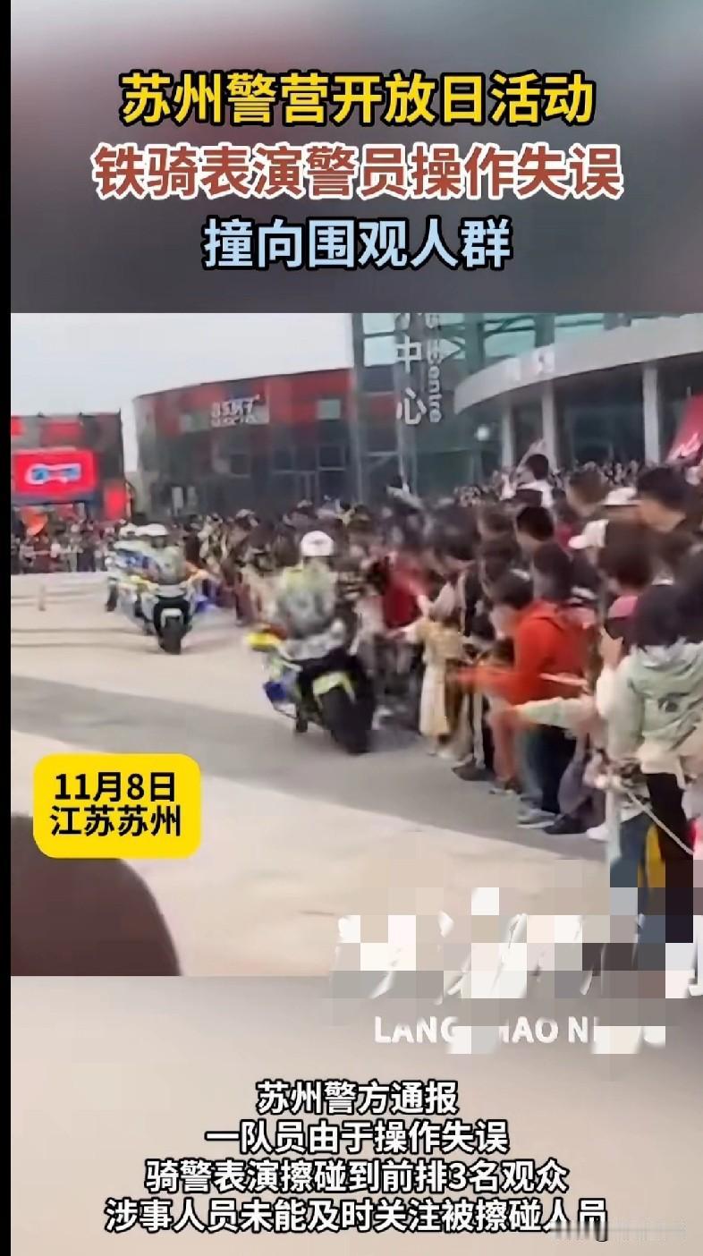 苏州警营开放日这波操作,真让人捏把汗! 家人们谁懂啊!苏州警营开放日的铁骑表演,居然出岔子了! 11月8号那天,本来是警队秀操作的场面,结果有位警员估计是没控住车,直接往围观人群冲过去了!看现场视频里那乌泱泱的人,前排都挤着看热闹,突然来这么一下,想想都后怕! 后来警方说擦碰了3个观众,而且涉事的人还没及时管被撞到的。咱就是说,这种表演本来是拉近和大家距离的,安全肯定得放第一位啊,这失误也太让人揪心了! 希望被碰到的观众没大事,也希望以后这种活动能把安全措施再做足点~