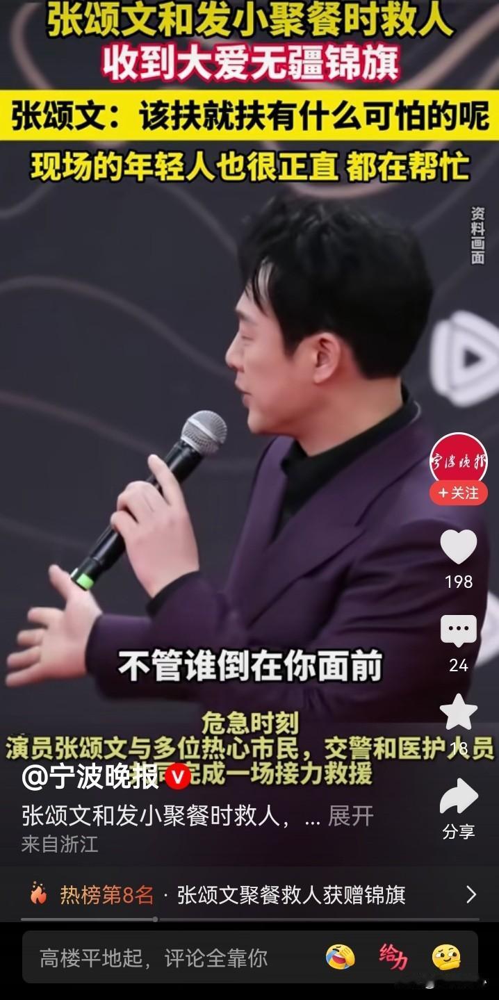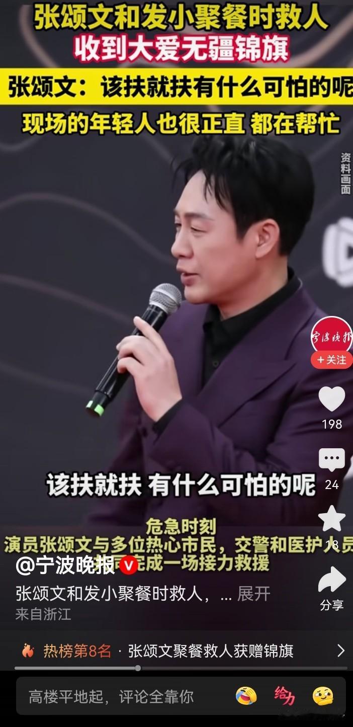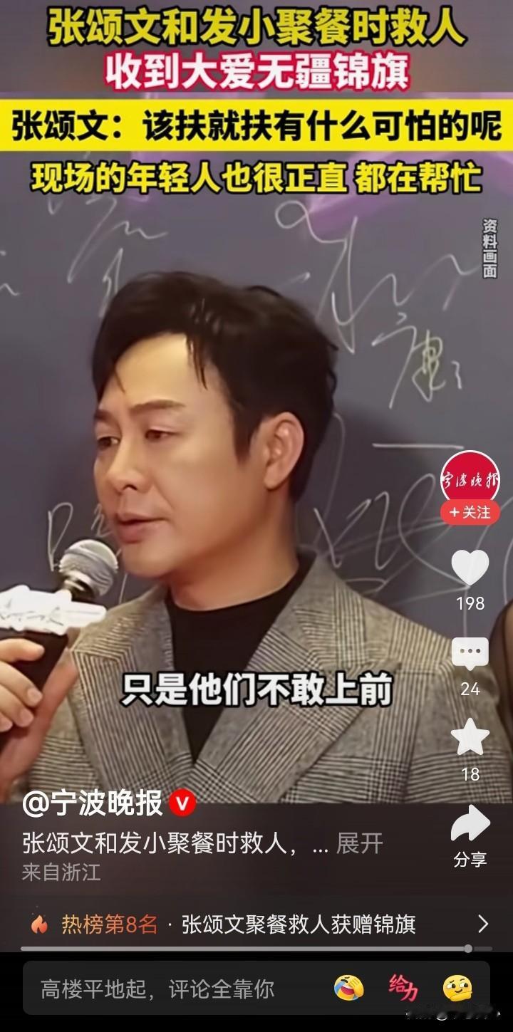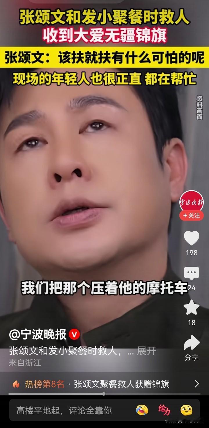 张颂文一句,“在场的那几个年轻人,也很正直,只是他们不敢上前”,说出了问题所在,他是名人,敢扶,普通人要考虑后果,就不敢扶了…… 张颂文聚餐时救人,还收到事主石先生送来的锦旗。本来以为是他怎么见义勇为,比如跳水救人,后来在视频里的描述,就是把一个出了交通事故的人扶了起来(施以援手)。 再仔细看相应的报道,也还是不简单,他是从轿车后视镜发现倒地的摩托车和蜷缩的人影,再返回去救助的。那时,已经有几个年轻人在场,也拨打了报警电话,只是因为现场没有肇事车辆,也没有刹车痕迹,有人担心讹诈,而不敢向前。此时,受伤的石先生还被电动车压着。张颂文要上前的时候,有年轻人还提醒他…… 不说怎么英勇的从水里、火海里救人,只是在确认安全的情况下,扶起受伤躺在地上的伤者,或搬去压在伤者身上的东西,什么时候就已经需要这么大的勇气,需要见义勇为了啊。据说,当年,2006年吧,有一个法官,说了一句,“不是你撞的人,你为什么扶”,让国人的勇气都消退了很多…… 类似的事情还有很多。 今天,张颂文作为公众人物,他能带个好头,期望后续也有更多的普通人能做到在确认安全的情况下,能勇敢地扶起受伤倒地的人吧……