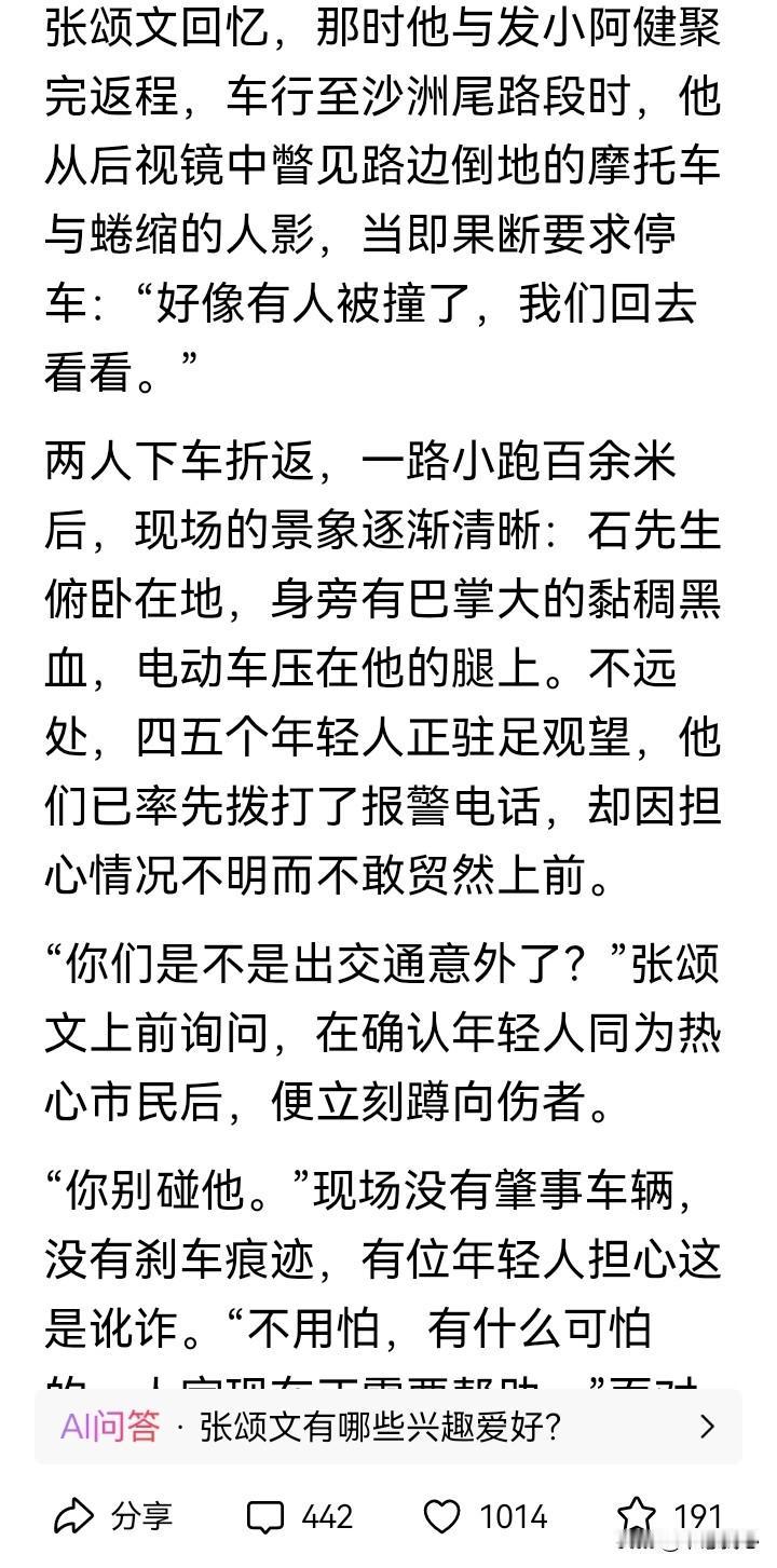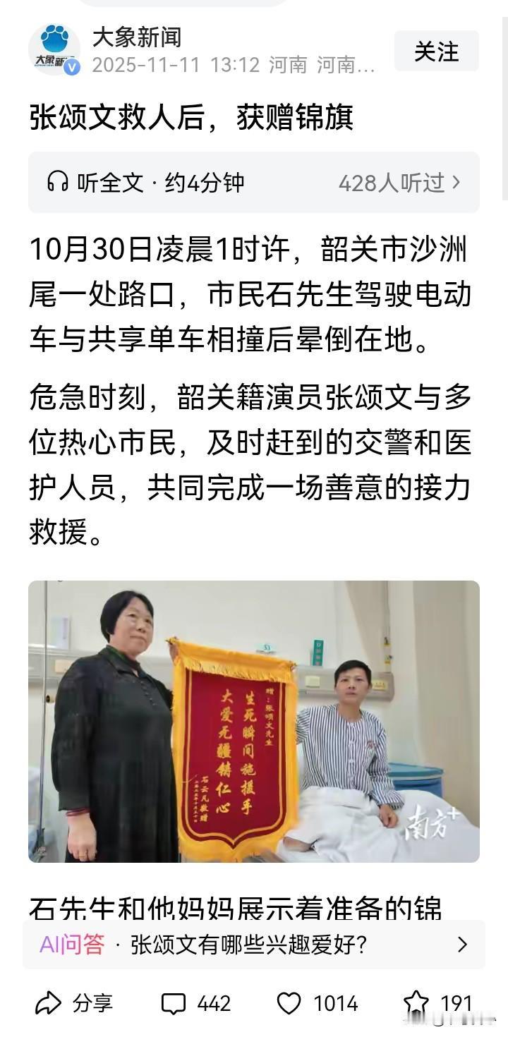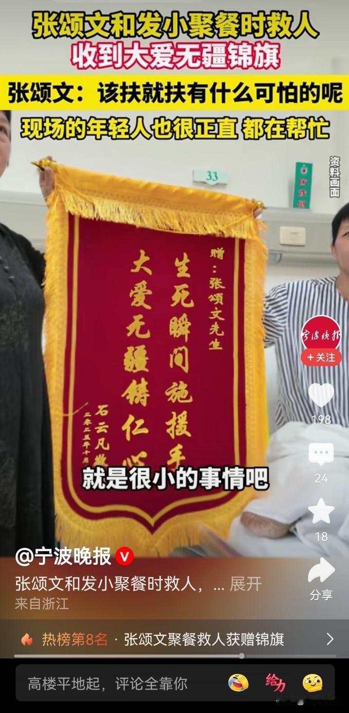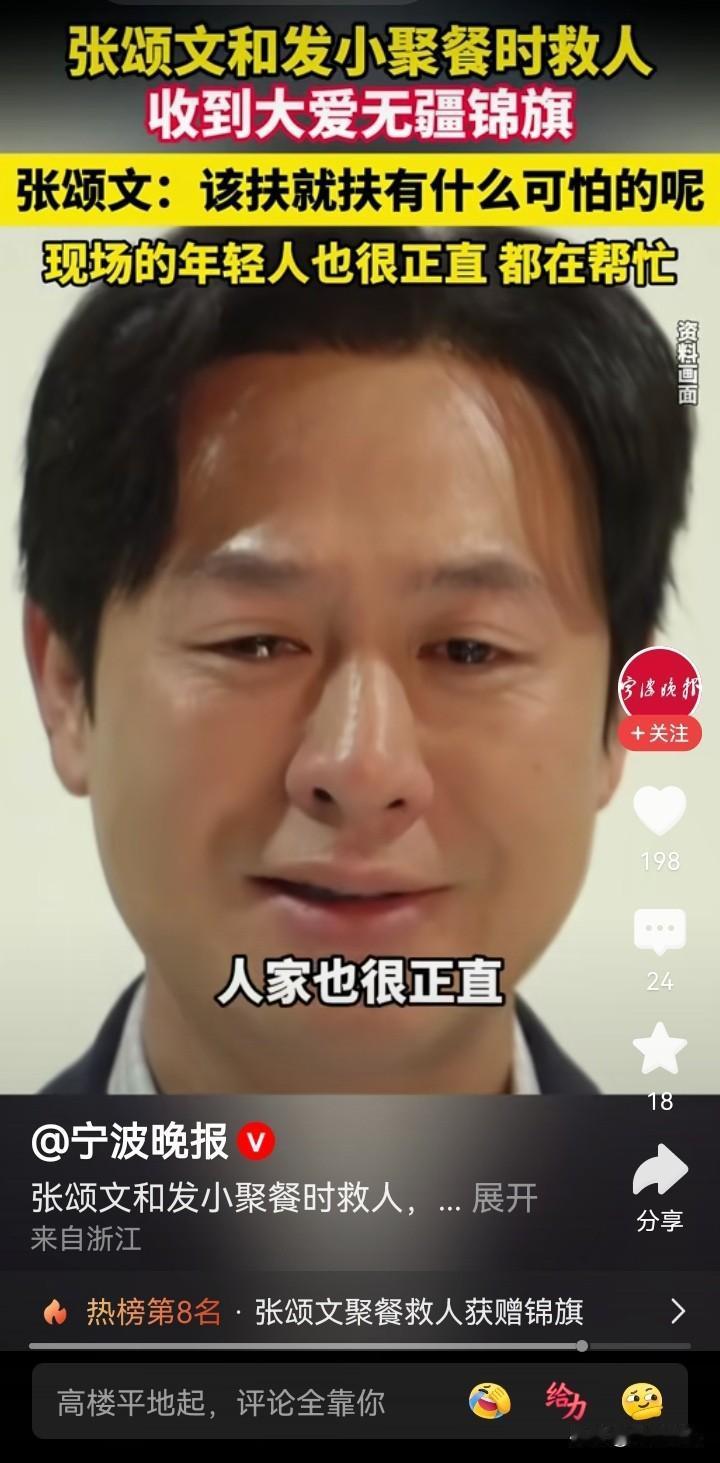 张颂文一句,“在场的那几个年轻人,也很正直,只是他们不敢上前”,说出了问题所在,他是名人,敢扶,普通人要考虑后果,就不敢扶了…… 张颂文聚餐时救人,还收到事主石先生送来的锦旗。本来以为是他怎么见义勇为,比如跳水救人,后来在视频里的描述,就是把一个出了交通事故的人扶了起来(施以援手)。 再仔细看相应的报道,也还是不简单,他是从轿车后视镜发现倒地的摩托车和蜷缩的人影,再返回去救助的。那时,已经有几个年轻人在场,也拨打了报警电话,只是因为现场没有肇事车辆,也没有刹车痕迹,有人担心讹诈,而不敢向前。此时,受伤的石先生还被电动车压着。张颂文要上前的时候,有年轻人还提醒他…… 不说怎么英勇的从水里、火海里救人,只是在确认安全的情况下,扶起受伤躺在地上的伤者,或搬去压在伤者身上的东西,什么时候就已经需要这么大的勇气,需要见义勇为了啊。据说,当年,2006年吧,有一个法官,说了一句,“不是你撞的人,你为什么扶”,让国人的勇气都消退了很多…… 类似的事情还有很多。 今天,张颂文作为公众人物,他能带个好头,期望后续也有更多的普通人能做到在确认安全的情况下,能勇敢地扶起受伤倒地的人吧……