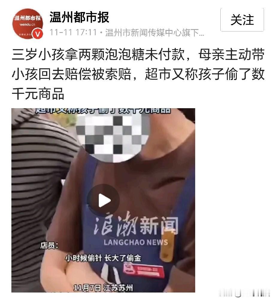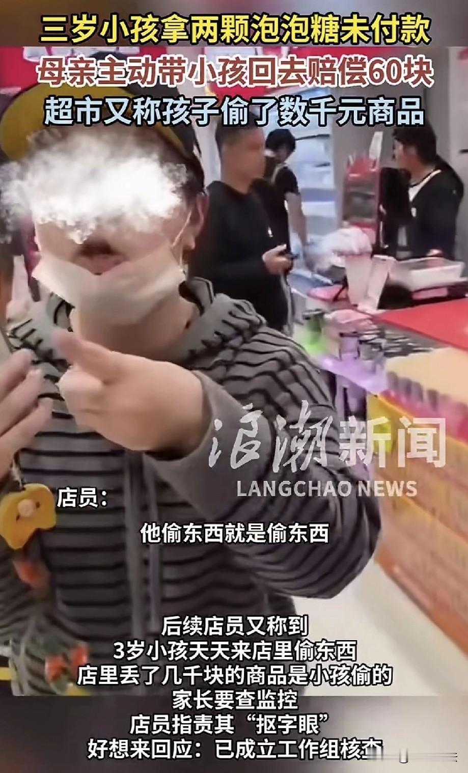 3岁孩子能偷几千元东西?江苏苏州,一女子发现,3岁孩子拿了超市2块泡泡糖未付钱,女子立刻到超市退还,向超市道歉,赔超市60元,超市却说,最近丢失几千元商品都是他家孩子拿的,女子不愿意了,孩子父亲赶到,要超市拿出监控,如果证据确凿,10倍,100倍赔给超市,谁知超市人员说了番话,令人大跌眼镜! 一女子带3岁的孩子和另一个孩子一起外出购买东西,路过一家超市,女子停了下来。 女子没有到超市里面,只是在外面的地方购物,谁知两个孩子高兴,蹦蹦跳跳,直接就进了一旁的超市里面。 孩子进了超市,超市里的商品琳琅满目,3岁的孩子懵懂无知,拿起两个泡泡糖走了出去。 孩子出来,超市营业员并没有看到孩子拿了东西,也许是孩子个子太低,她没有看到,也许是那一会正在忙碌,孩子出门她没注意。 女子在超市外面,一会功夫就不见了孩子,她心急火燎,正在周围寻找孩子,两个孩子从超市出来,女子这才长出口气。 女子带着孩子就往回走,可是她突然发现,孩子手里攥着两个小东西。 她俯身一看,原来是两个泡泡糖,女子心里一惊,自己并没有给孩子买过这样东西。 女子立马追问,这两个泡泡糖是哪里来的,孩子如实告诉妈妈,泡泡糖是从刚才路过的超市里拿的。 女子第一反应是有点生气,但转念一想,3岁孩子哪懂什么付钱,他只知道这个东西好看,想拿到手里玩耍而已。 女子告诉孩子,这泡泡糖是超市的,咱们得付钱才能拿回家里,没给钱就拿走是不对的。 孩子似懂非懂,跟着妈妈回到了超市,女子直奔超市收银台去,想着赶紧把钱付了,顺便给孩子一个小小的教育。 女子拿出两个泡泡糖,她连连道歉,说孩子太小,拿了两个泡泡糖没有付钱。 她发现后,立刻就来归还,作为孩子的家长,她给超市道歉。 谁知超市店要求,要她按上一位顾客的购物小票付款,女子一看,那张小票上是60块钱。 虽然这个金额远超那两块泡泡糖的价格,但是女子没有多说,毕竟是自己家孩子有错在先,拿走了超市的泡泡糖没有付钱。 女子以为,给了60元就当买了个教训,这事就算过去了,谁知超市老板娘又说,最近超市丢失了几千元的商品,都是女子3岁孩子偷的。 女子一听,顿时气的火冒三丈,这话从何而来,一个3岁的孩子,咋可能偷你几千元的东西? 你就是给他,他也根本就拿不动,谁知店员吼道:小时候偷针,长大了偷金! 女子一看,立刻给丈夫打去了电话,丈夫和朋友赶到,一看这种情况,立刻就和超市理论。 小孩子父亲说道,我老婆看到后就让他送回来了,我们已经教育了孩子,是谁提出要按上一单购买价格给付款的? 一个3岁的孩子,连基本的认知能力都还达不到的! 谁知店员大声说道: 他天天来拿,然后分给别的小孩! 孩子父亲愤怒至极,你说这话要有根据,你说我孩子天天来拿,你拿出来监控!我10倍,100倍赔你! 谁知超市拿不出监控,反而指责孩子家长,说家长抠字眼,偷东西就是偷东西! 孩子被吓得缩成一团,他小小的心灵,不知道发生了什么,他并不知道,自己拿的那两块泡泡糖竟然引起了轩然大波。 家长把视频发到了网上,迅速引起了热议。 有人认为,3岁孩子根本就不懂,家长还主动去赔偿,证明人家家长也是在正确的引导孩子。 几千块钱的东西,孩子就是从刚出生就去拿到3岁也拿不了那么多吧!这店员说话不过脑子。 自古至今都是说开门做生意要和气生财,笑脸和善意是好商家最该具备的品质。 几千元的物品失窃,这锅让一个3岁的小孩背,于情于理也说不过去! 本来家长发现孩子拿了超市的东西,第一时间就返回去道歉赔偿,原本是想就事论事,借机教育孩子不能随便没付钱就拿人家的东西。 商家这种做法,不但让孩子的家长愤怒寒心,更会影响到孩子的身心,商家让孩子看到,道歉赔偿也解决不了问题。 事件经过发酵,引起一片的热议,记者连线了该超市热线,工作人员回应,公司已成立工作组紧急处理。 希望商家能及时回应,拿出监控和证据,既然能当场指责一个3岁孩子偷了几千元商品,能说这话就要承担负责。 根据最高院相关解释,不满14周岁未成年人盗窃不构成犯罪,3岁孩子属无民事行为能力人,无犯罪认知和责任能力,超市称其“偷几千元商品”无法律依据 。 《民法典》第1188条及相关司法解释规定: 无民事行为能力人造成他人损害,监护人需承担赔偿责任,但仅针对实际损害。 家长已主动退还泡泡糖并超额赔付60元,已履行监护责任,超市无权要求额外赔偿 。 根据“谁主张谁举证”原则,超市指控孩子多次盗窃,需提供监控等有效证据,其无证据却指责家长,属侵权行为,可能侵犯孩子名誉权。 超市要求按60元小票付款,远超泡泡糖实际价值,属不合理要求,家长可主张返还超额部分。 超市无证据指控无民事行为能力人盗窃,且超额索赔,无法律依据,家长可通过法律途径维护自身及孩子合法权益。 关注@王哥说法 多学法律少吃亏!