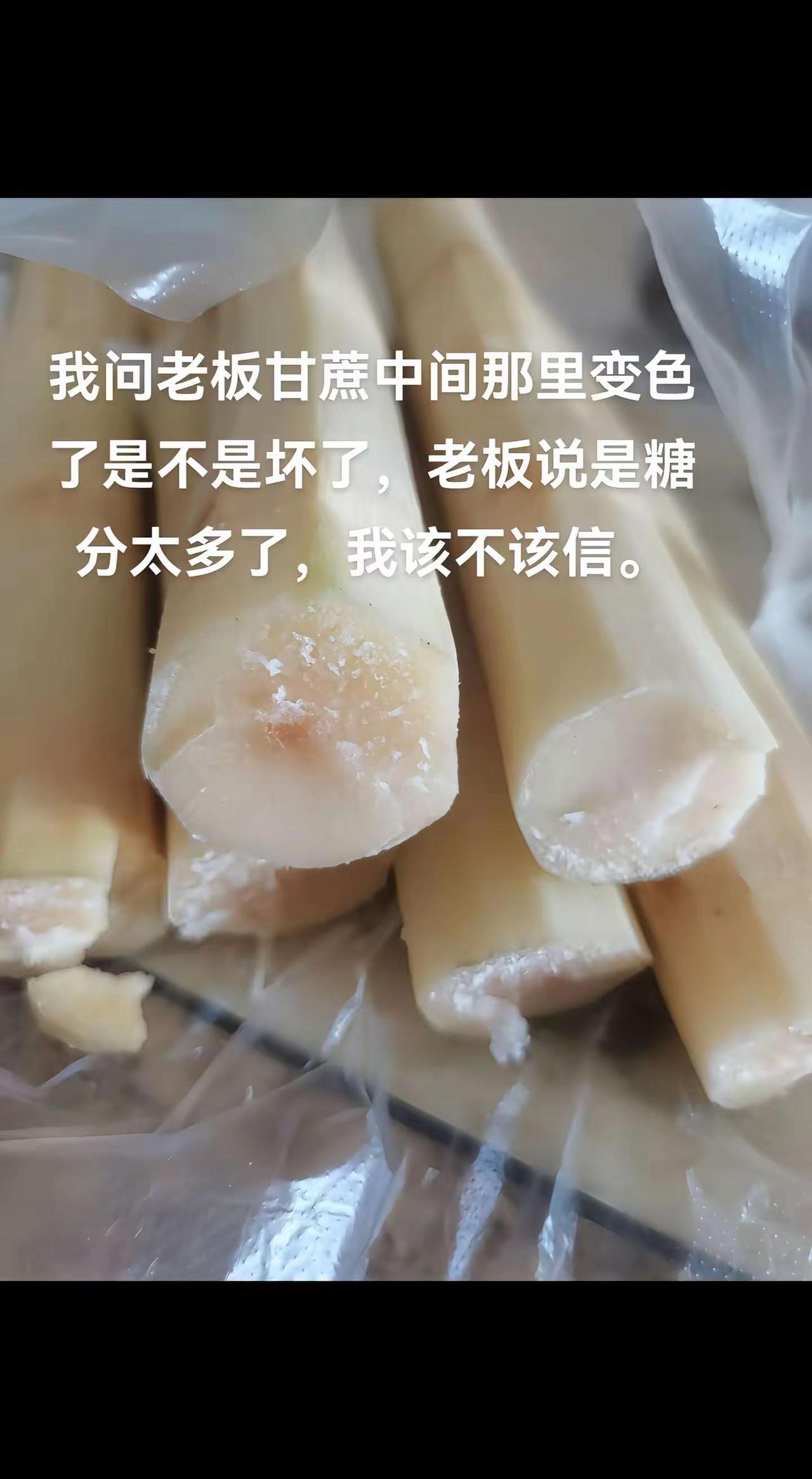 广西甘蔗甜过初恋。 我问老板, 甘蔗中间那个变色的是不是坏了?老板说是糖分太多了,我该不该信他?