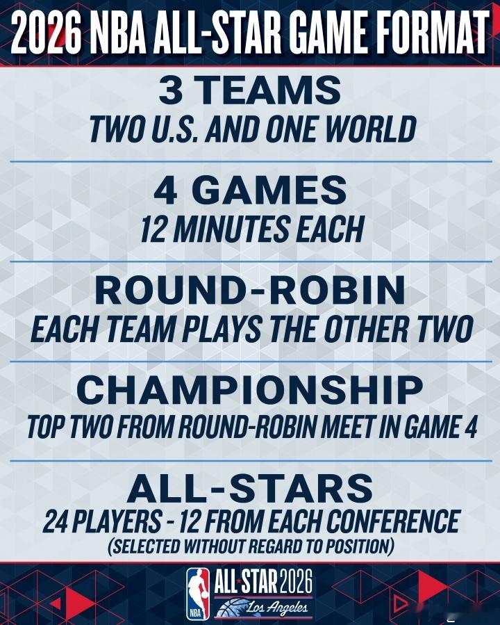 美国队真的不会被打爆吗? NBA官宣2026年全明星将开启美国队VS世界队的全新赛制! 两支美国队和一支世界队,打四场比赛,每场12分钟,将不再区分位置。