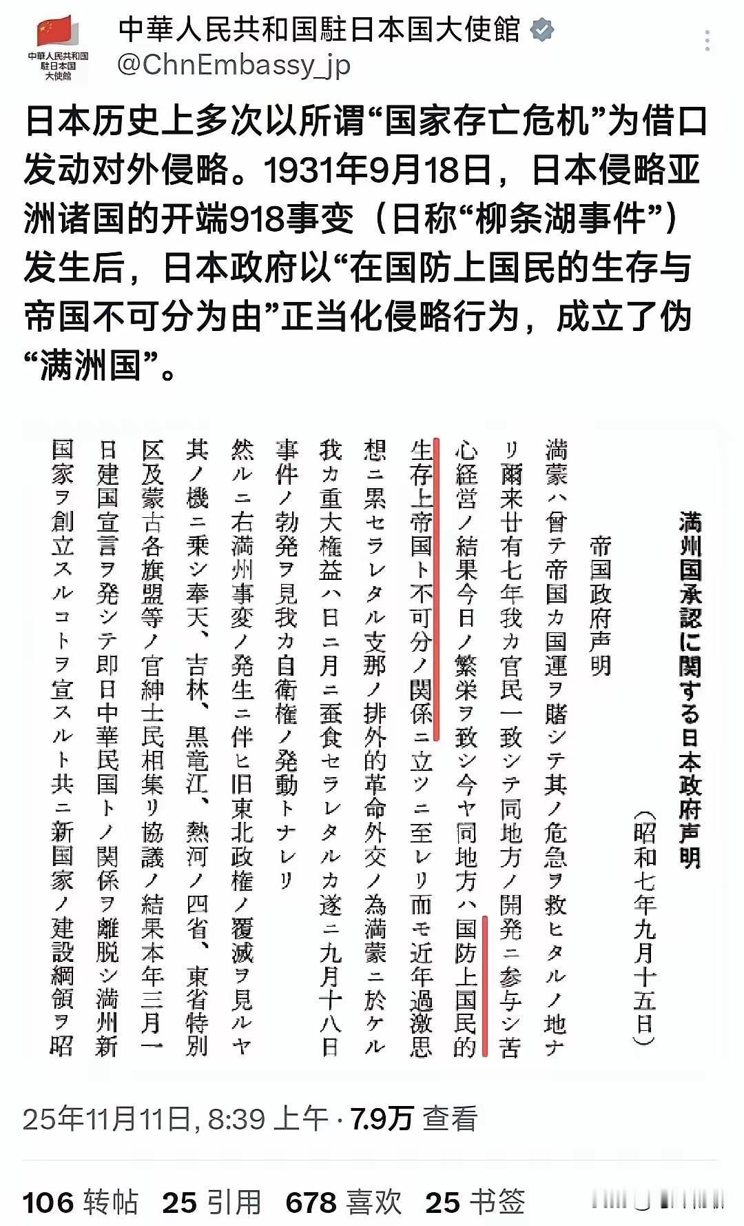 看来高市早苗近期涉台不当言论这个事已然闹大了,本来只是薛剑领事发文回怼,没想到竟慢慢演变成外交部发言人义正言辞警告,及随后驻日大使馆发文驳斥。 要我说,这个事已经挑明了,高市早苗的这个行为就是在为侵略战争做准备,和当初侵华时的动作一模一样。不过,咱们现在就要从容许多,有英勇的人民解放军作为坚强后盾,不怕她不来,就怕她只是过过嘴瘾,最后怂了不敢来!(图片来自网络)高士早苗