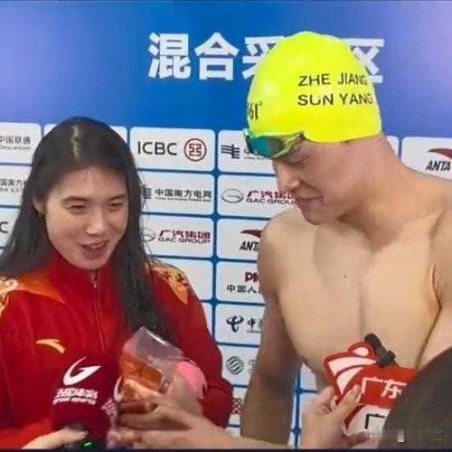 孙杨摸张雨霏金牌求沾喜气!全运名场面太甜,这友情谁不羡慕? 全运会游泳赛场也