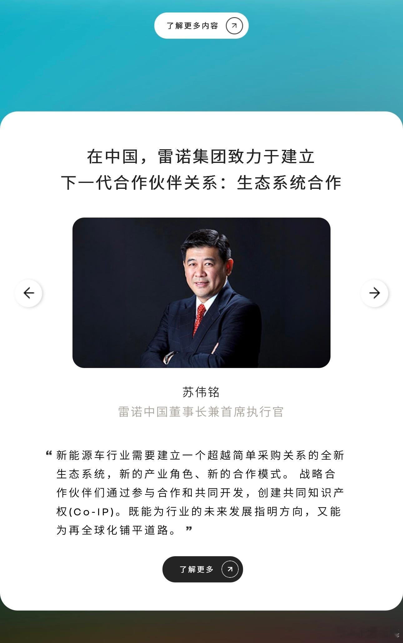 刚才刷到一条资讯,主要讲的是雷诺新一代Twingo发布了,由中国和欧洲协作开发等。顺手搜了下发现,雷诺集团在中国还保留有官网、且还在保持更新,同时还有雷诺集团中国董事长兼CEO这个职位。我原以为随着2020年雷诺整车业务退出中国,雷诺集团在国内没有任何布局了呢。