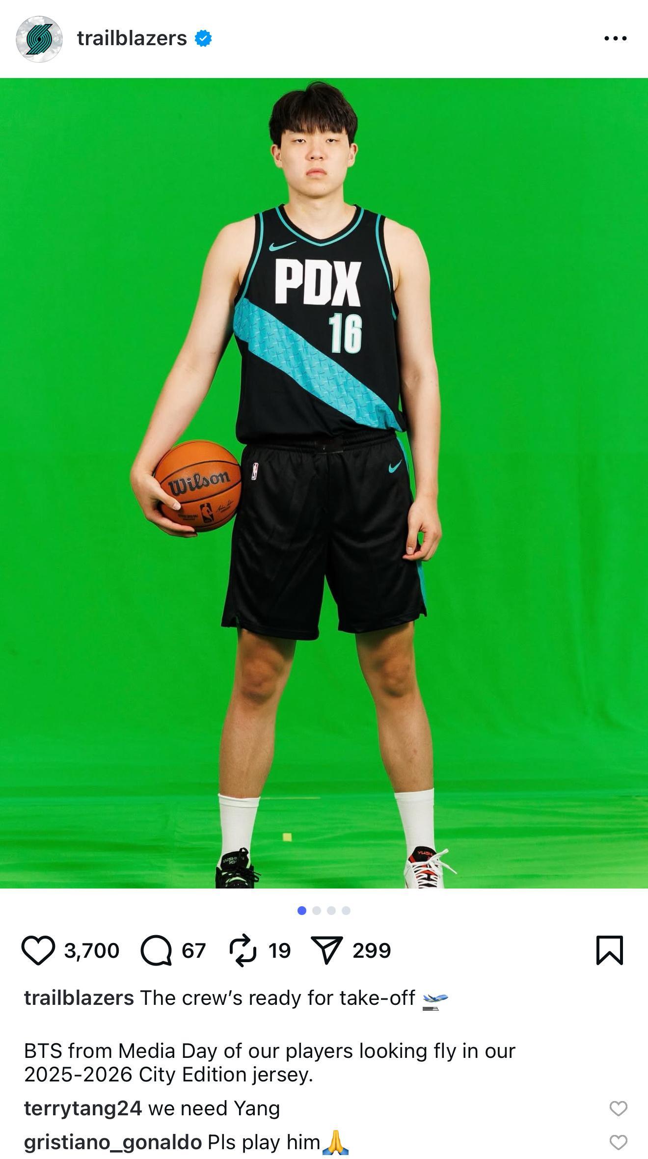 开拓者正式上架城市版球衣和周边,杨瀚森被放上带货海报,球迷在评论区留言:让他上场打球。
