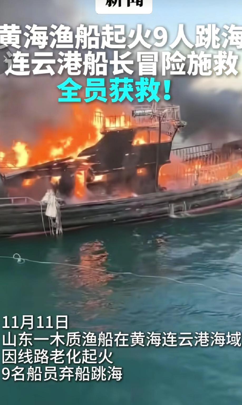2025年11月11日,山东一木质渔船在黄海连云港海域因线路老化起火,9名船员弃船跳海。连云港赣榆区苏赣渔02002号渔船船长李宝山发现后,立即中止作业,带领船员冒着火势与爆炸风险展开施救,多艘渔船随后也参与协助。最终,9人全部获救,并于当日14时37分乘海巡船前往赣榆港安置。(来源于@澎湃新闻)