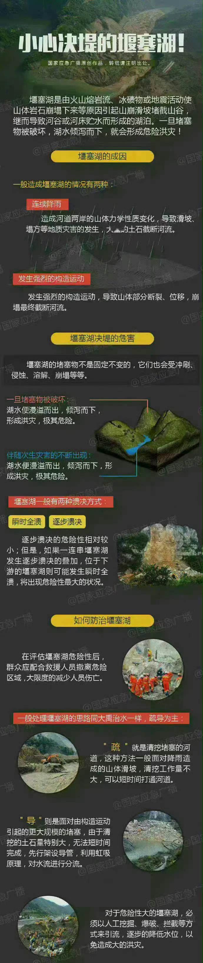 地震科普防灾科普小课堂【小心决堤的堰塞湖!】堰塞湖是由火山熔岩流、冰碛物或地震活动使山体岩石崩塌下来等原因引起山崩滑坡堵截山谷,继而导致河谷或河床贮水而形成的湖泊。一旦堵塞物被破坏,湖水倾泻而下,就会形成危险洪灾。堰塞湖决堤的危害有哪些?如何防治堰塞湖?戳图了解↓