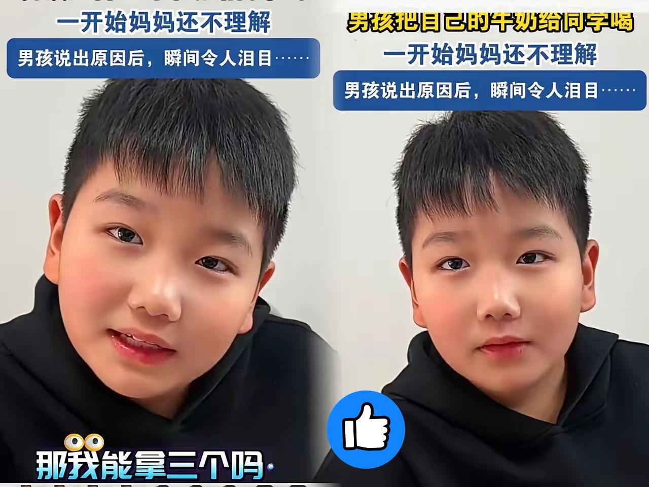 刷到个暖心视频, 看完眼眶直发热!一个小男孩每天都把自己的牛奶分给同学, 妈妈起初不解:“他妈妈不会给他买吗?”男孩乐呵呵的一句“他没有妈妈”,让妈妈瞬间沉默。 没过多久妈妈主动说下次带两盒,可男孩却祈求带三盒,原来同学还有个小妹妹要照顾。 这一幕真的戳中人心,善良从不是天生的,而是被家庭用爱浇灌出来的。 妈妈没有指责孩子“吃亏”,反而立刻体谅对方的难处,这份通透和温柔, 才是给孩子最好的言传身教。很多时候,我们总想着教孩子精明,却忘了善良才是最珍贵的底色。 这样的家庭,没有刻意说教,却用行动教会孩子共情与付出。 其实幸福很简单,就是一份发自内心的善意,和懂得成全善意的家人。 你家孩子做过哪些暖心小事?评论区分享下,让这份美好传递下去~小屁孩暖心瞬间