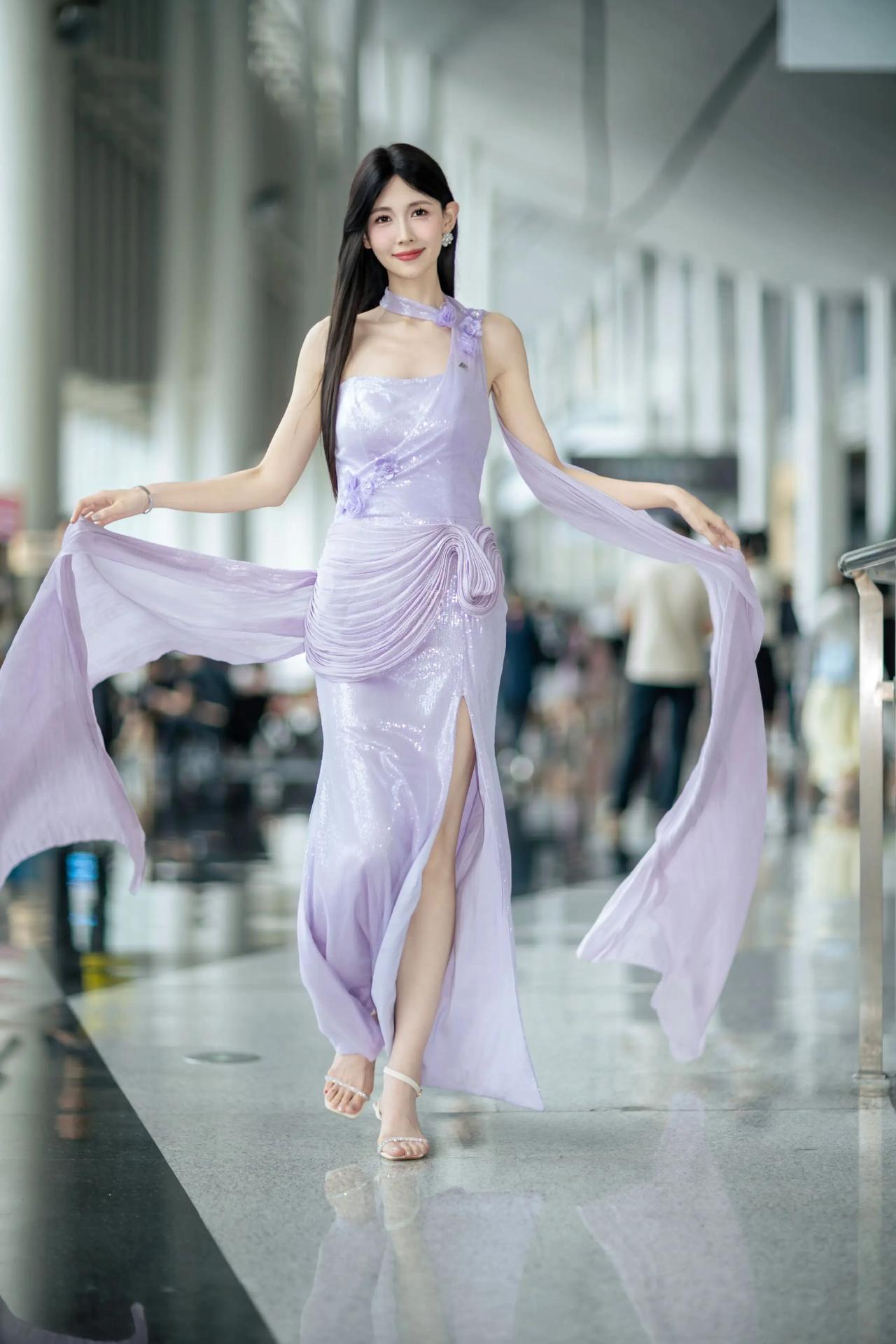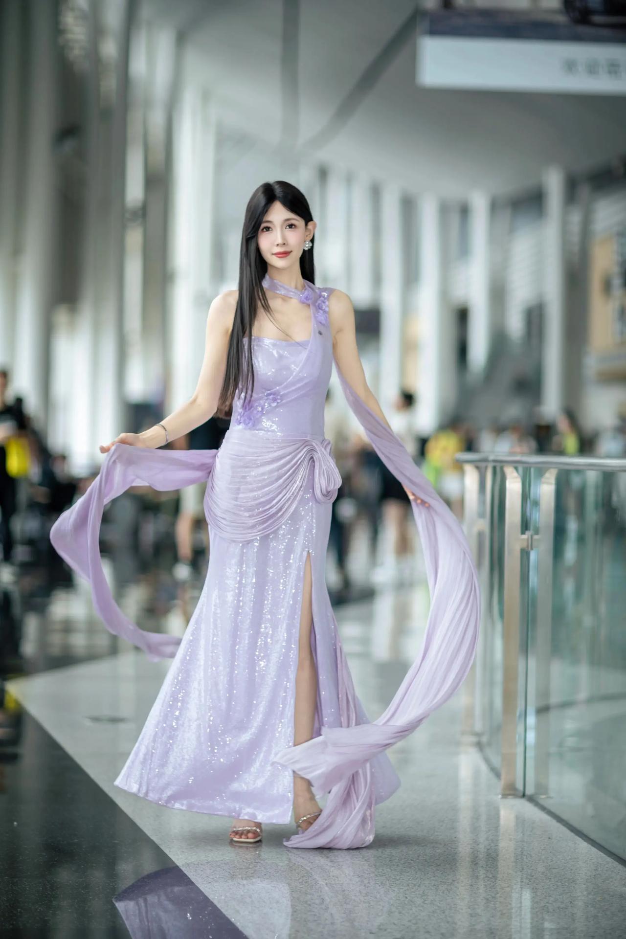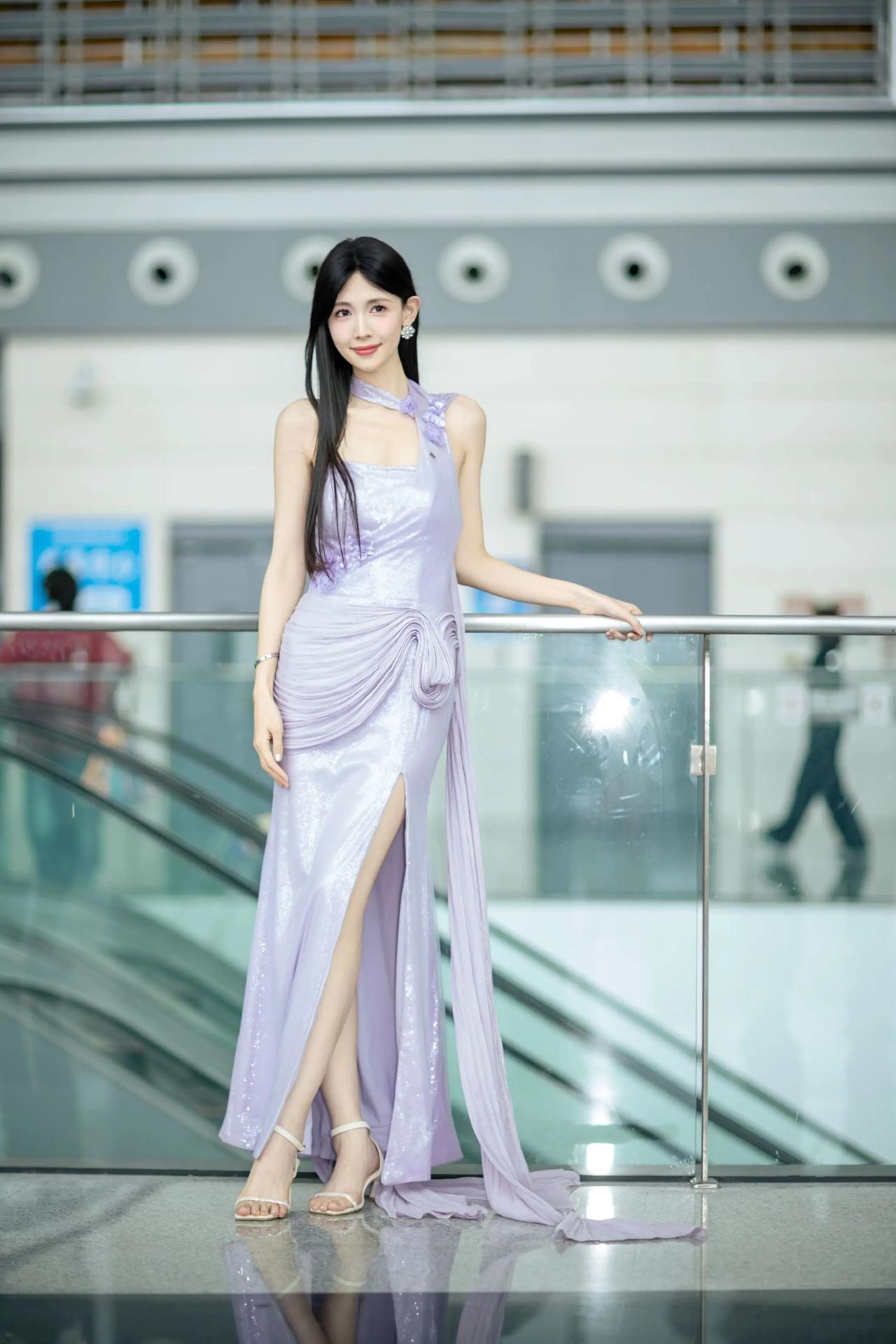 玻璃栏杆的凉意透过指尖传来,她微微侧身,让裙摆的褶皱在空气中划出优雅的弧度。紫色长裙像一片夜幕笼罩在身上,上半身的亮片在灯光下闪烁,仿佛银河倾泻而下。无肩带的设计让精致的锁骨与肩线完全展露,肌肤在紫色丝缎的映衬下泛着珍珠般的光泽。 她的左手轻轻托着下巴,指尖染着与裙色相配的浅紫色指甲油,这个不经意的动作让全场目光都聚焦在她身上。右手扶着的玻璃栏杆倒映出模糊的人群与建筑轮廓,那些闪动的光影像是被揉碎的星河,在她身后流淌。披肩的长发如瀑布般垂落,发丝间偶尔闪过几缕精心挑染的浅紫,与裙装呼应得恰到好处。 浅色高跟凉鞋踩在大理石地面上,发出清脆的声响。鞋跟的高度让她的身姿更加挺拔,每一步都像是踩着音乐的节拍。裙摆的褶皱在行走时舒展开来,像一朵正在绽放的紫罗兰,随着动作轻轻摇曳,将空气都染上了优雅的韵律。 背景的灯光柔和而现代,宽敞的空间里人群如潮水般流动。她的微笑像是这喧嚣中的一泓清泉,既不张扬也不刻意,只是自然地流露着自信与从容。那些模糊的建筑结构在她身后形成抽象的几何图案,像是为她搭建的舞台,而她便是这舞台上最耀眼的主角。 在这片光影交织的空间里,她仿佛是从时尚杂志里走出来的封面女郎,紫色的长裙不仅是服饰,更是一种态度的宣言。亮片的闪烁、褶皱的流动、玻璃的倒影,所有元素都在她身上达到完美的平衡,诠释着现代都市女性的优雅与时尚。