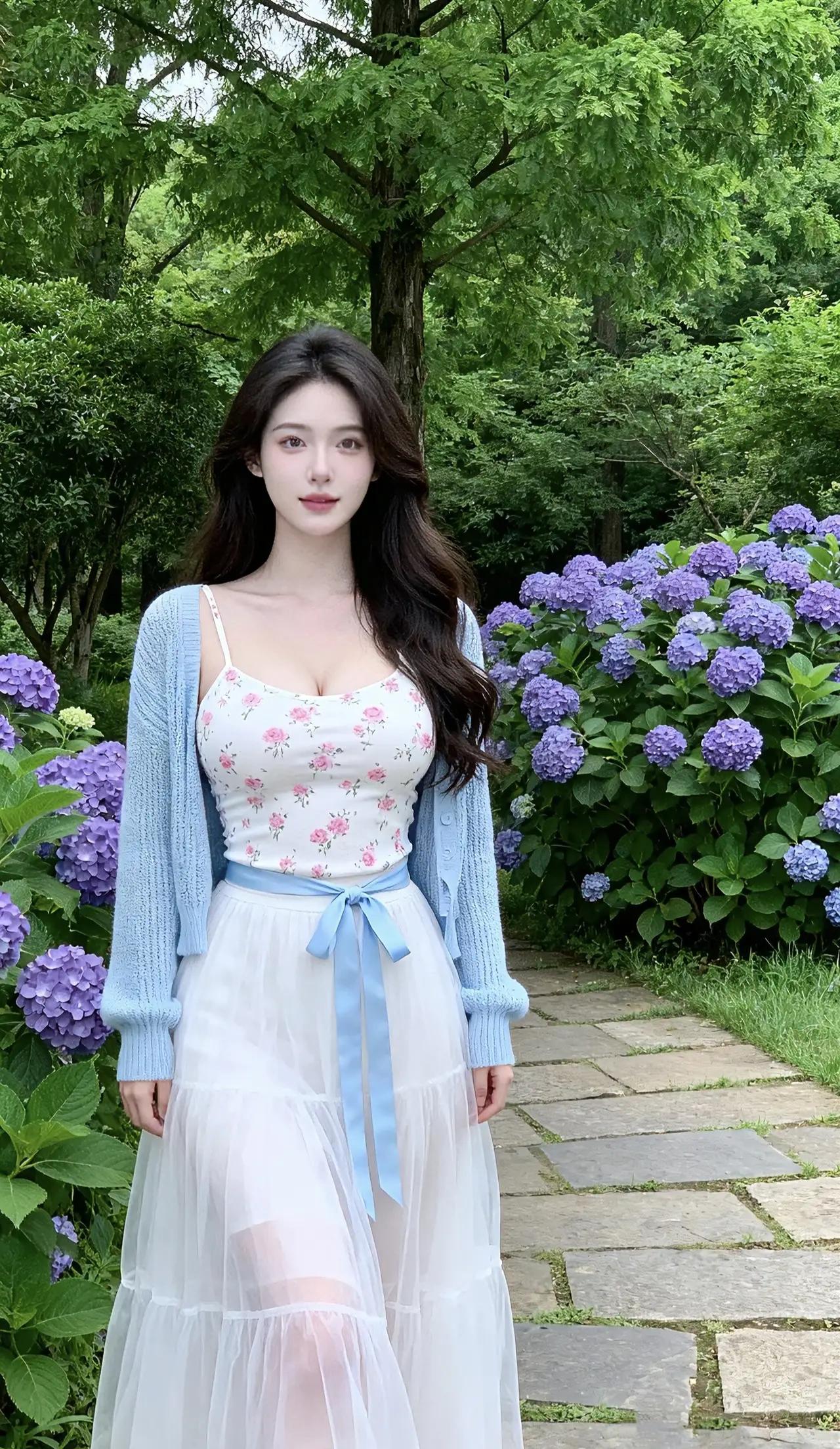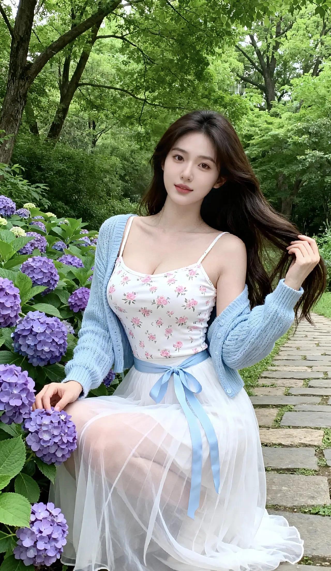 春园漫步 在一个风和日丽的春日午后,阳光透过树叶的缝隙洒在石板小径上,形成斑驳的光影。一位年轻的女子漫步在这片绿意盎然的花园中,她身穿一件白色吊带上衣,上衣点缀着粉色花朵图案,显得清新而甜美。一条白色纱质长裙轻盈地垂至脚踝,腰间系着一条浅蓝色丝带,随着她的步伐轻轻飘动,增添了几分柔美。 她外搭一件浅蓝色针织开衫,开衫的质感和颜色与丝带相得益彰,整体造型和谐自然。她的长发随风轻扬,脸上带着淡淡的微笑,仿佛沉浸在这片宁静而美丽的景色中。 花园的四周,紫色绣球花盛开得正艳,花瓣层层叠叠,散发着淡淡的香气。绣球花丛中,蜜蜂和蝴蝶忙碌地穿梭着,为这静谧的春日增添了一抹生机。远处的树木高大挺拔,枝叶茂密,仿佛在守护着这片宁静的花园。 石板小径蜿蜒曲折,通往花园的深处。每一块石板都经过精心的打磨,表面光滑如镜,反射着阳光的光芒。小径两旁,绿草如茵,点缀着各种野花,红的、黄的、蓝的,五彩斑斓,如同大自然打翻了调色盘。 女子在小径上漫步,时而低头欣赏脚下的花草,时而抬头仰望蓝天白云。她的身影在花园中显得格外动人,仿佛与这片美景融为一体。阳光洒在她的身上,为她镀上了一层金色的光晕,让她看起来如同从画中走出的仙子。 整个花园充满了春天的气息,空气中弥漫着花香和青草的清新味道。微风拂过,带来一阵阵清凉,让人感到心旷神怡。这里仿佛是一个世外桃源,远离了喧嚣和烦恼,让人可以尽情地享受大自然的宁静与美丽。 在这片绿意盎然的花园中,女子找到了片刻的宁静和放松。她感受到了春天的气息,也感受到了生活的美好。这个春日午后,她与花园共同谱写了一段美好的回忆,这段回忆将永远留在她的心中,成为她人生中最珍贵的财富之一。