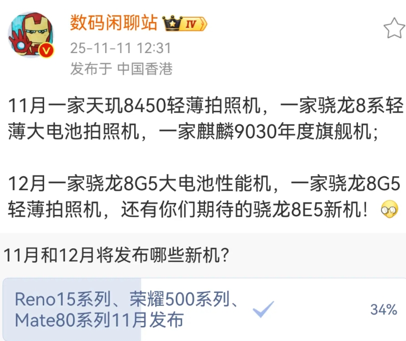 11月和12月将发布哪些新手机? 11月这三款好猜: Reno15系列、荣耀500系列、 Mate80系列。 那么12月2跟8根5是什么手机? 性能机+大电池,是荣耀GT吗?还是红米? 轻薄拍照机又是啥?
