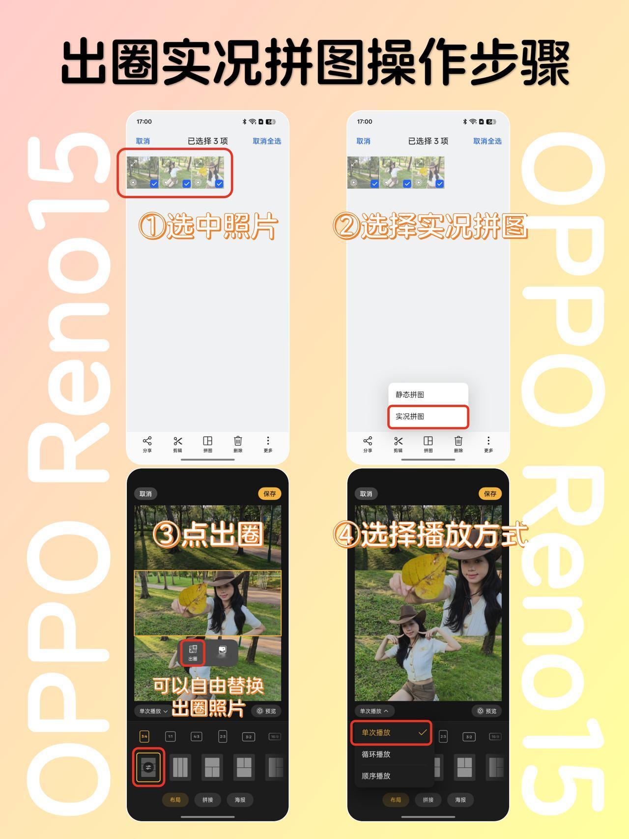相机党慕了!手机实况照片已next level... 现在的live图都玩出花来了😆 看看我刚刷到的OPPO Reno15「三拼实况」图 🌸不仅三张图拼起来都可以动 这个实况还能实现人物超过画框的效果 小姐姐直接放大出框,有种跟镜头互动的故事感,看着很有意思~ 让我这个相机党足足羡慕了一个早上😂 据说Reno15的操作超简单,牢记这个步骤即可:一拍二拼三出圈👇 1️⃣ 拍3张实况图,要有联动感; 2️⃣ 选择实况拼图,注意衔接; 3️⃣ 点击“出圈”,自由选择图片的人物or宠物出圈,就能实现出框实况效果啦~ 🤔以前的实况只是“能动”,现在都“能玩”了 不用各种修图软件,一拍二拼三出圈,三步就搞定出框实况👍 而且这手机还支持4K超清live,每一帧都很清晰~ 直出小🍠都不压画质,这点也很赞! live实况照片OPPO Reno15