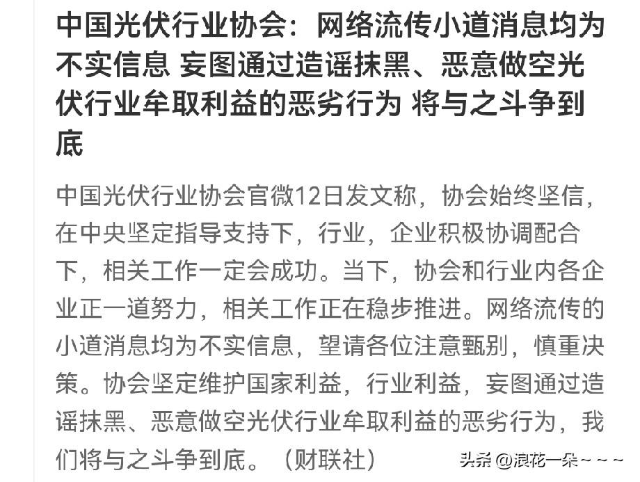 “敌人”用心险恶啊?! 谁在做空我们的光伏行业谋取利益?光伏协会的话已经说的很严重了,将与之斗争到底。 看来这造谣者,不是一般的造谣,肯定是非常严重影响非常巨大的造谣。 毕竟光伏行业是未来产业和绿色产业,全世界都在发展绿色能源,而且国外的绿色能源需求还是非常大的,你看看这些贫穷的地区,缺电缺的这么严重,就连欧洲等国家缺电也缺的非常严重。 在我国光伏产业发展非常好的情况下,技术领先的情况下,这些造谣一些“幺蛾子”出来肯定是居心不良啊!直接导致今天股市光伏板块大跌!