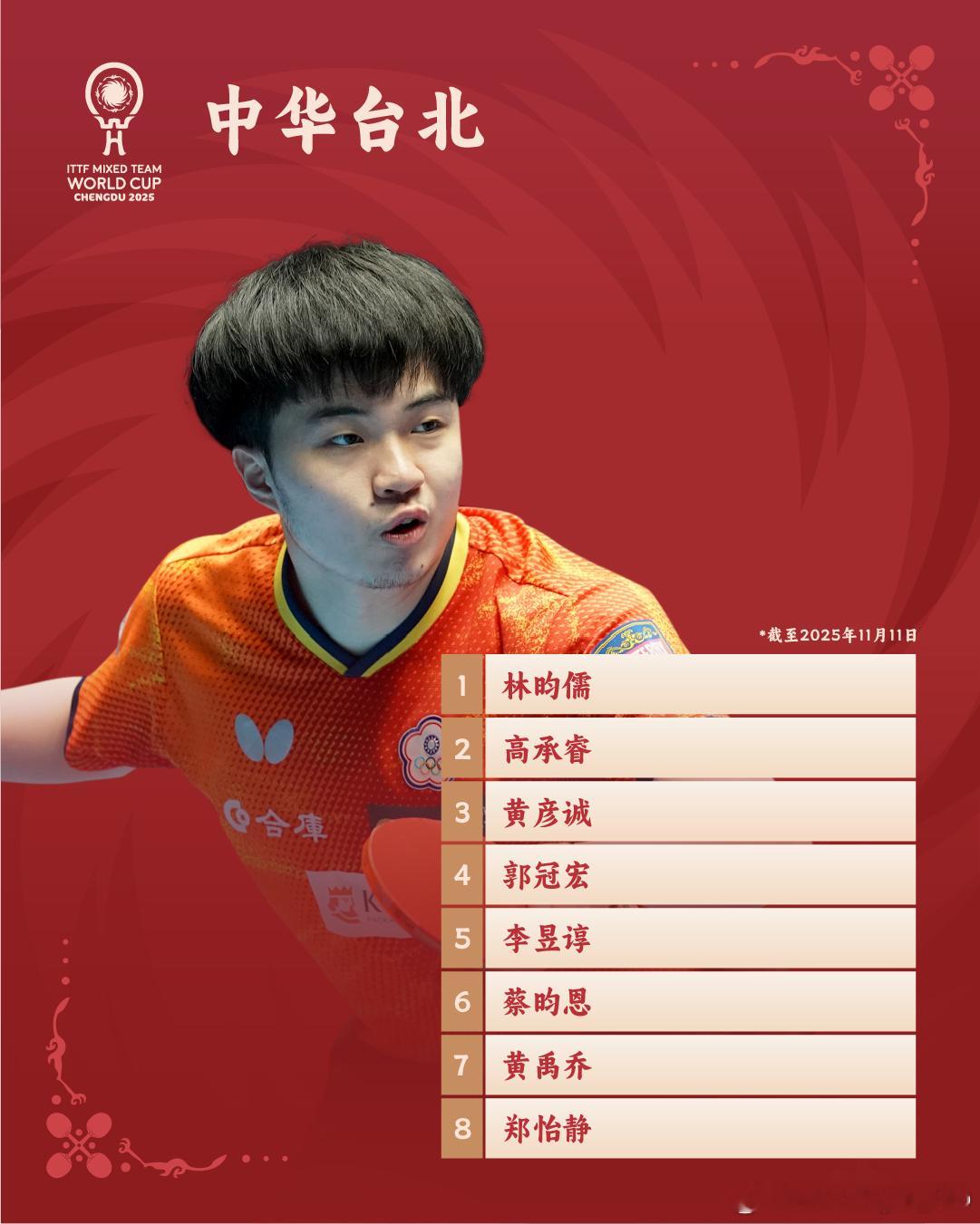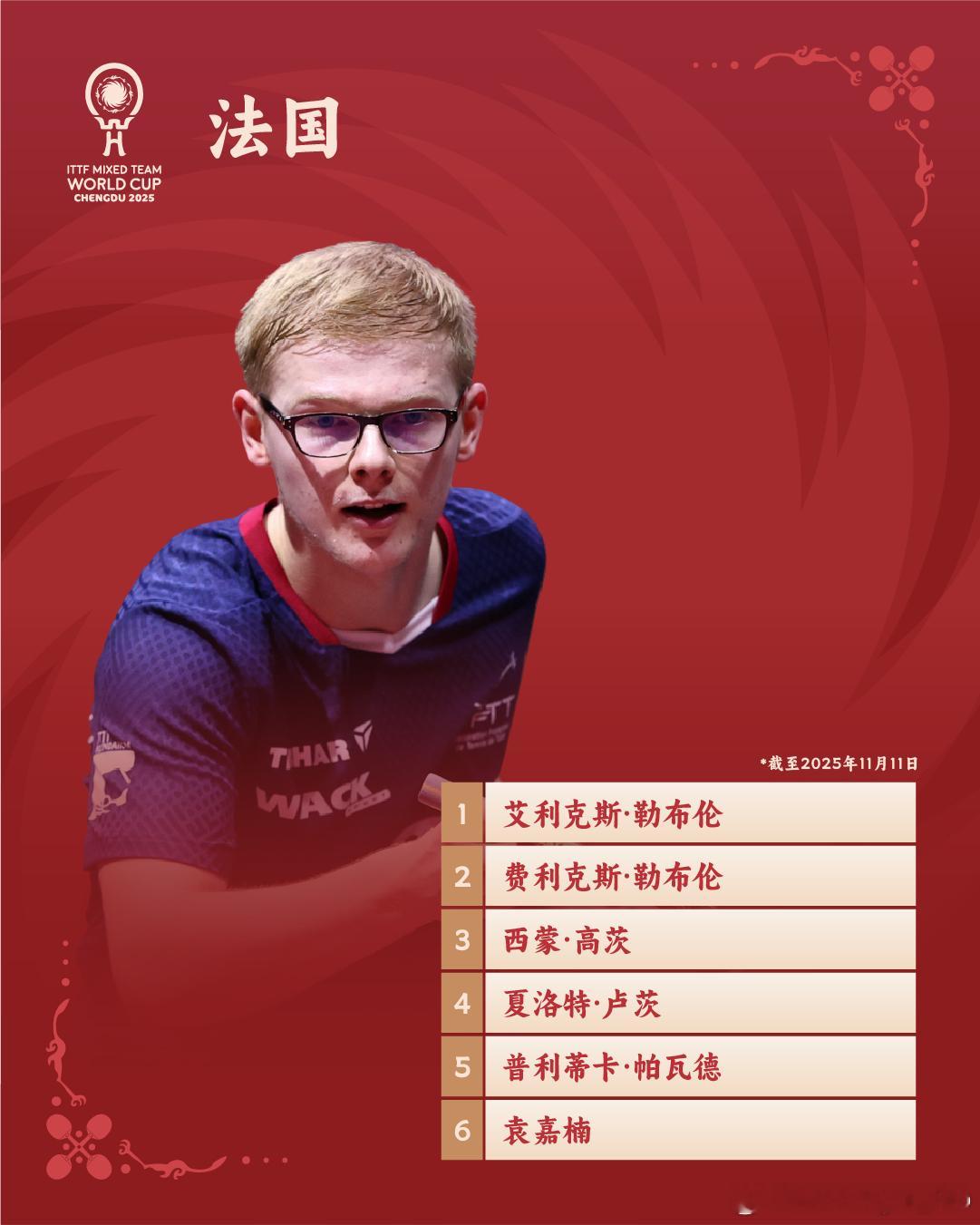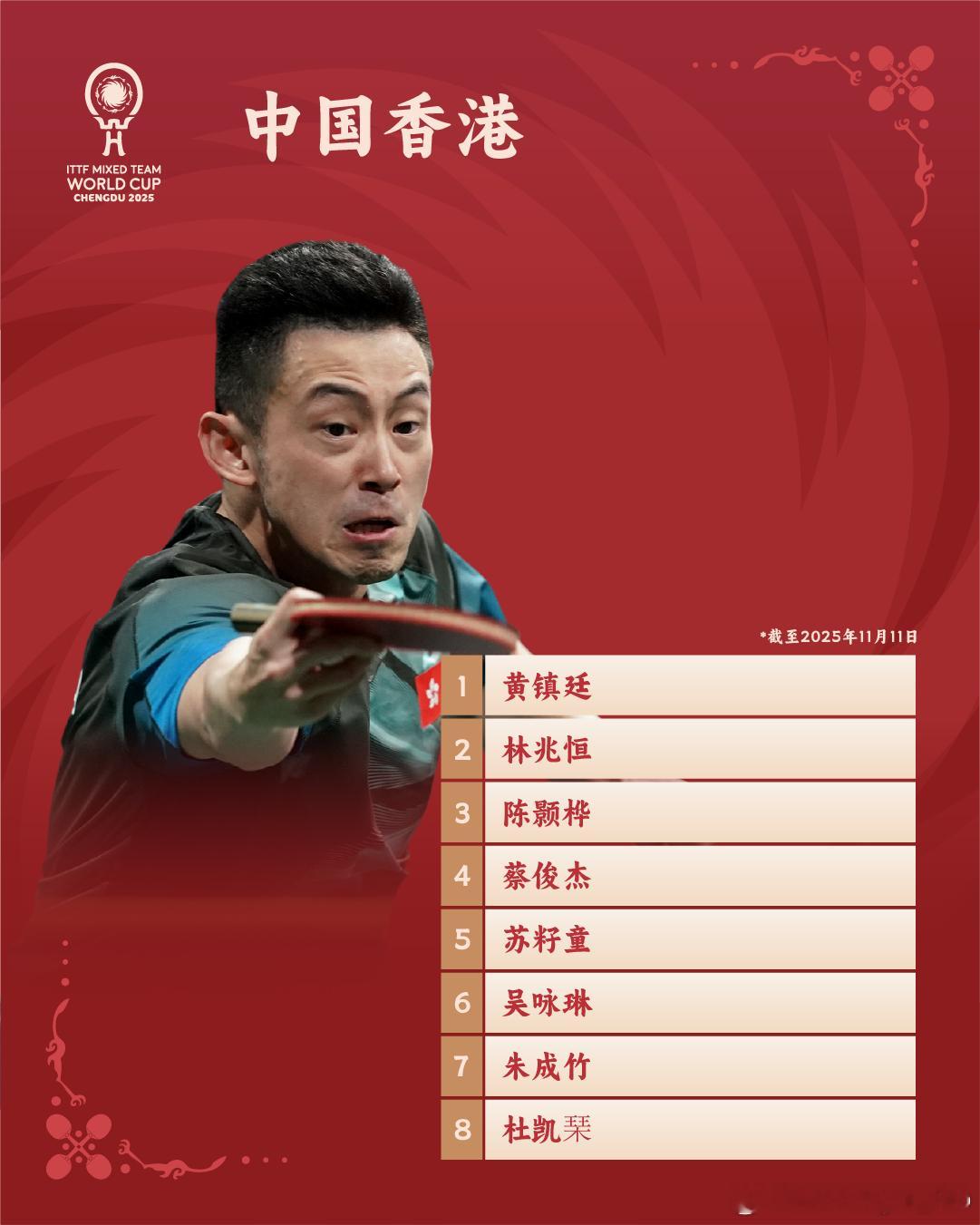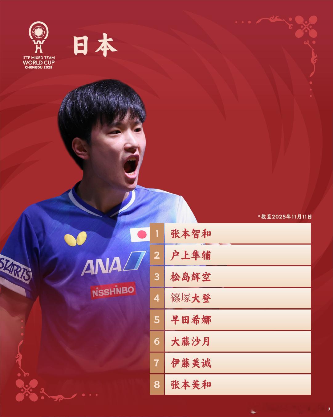 2025年成都国际乒联混合团体世界杯,将于11月30日至12月7日在中国成都举行,冠军队将获得2500点世界排名积分。国际乒联于今日正式公布参赛球员名单: 🇨🇳中国:王楚钦、林诗栋、梁靖崑、徐瑛彬、王艺迪、蒯曼、王曼昱、孙颖莎🇯🇵日本:张本智和、户上隼辅、松岛辉空、篠塚大登、早田希娜、大藤沙月、伊藤美诚、张本美和🇰🇷韩国:安宰贤、张禹珍、吴晙诚、朴康贤、崔孝珠、李恩惠、金娜英、申裕斌中国台北:林昀儒、高承睿、黄彦诚、郭冠宏、李昱谆、蔡昀恩、黄禹乔、郑怡静🇫🇷法国:艾利克斯·勒布伦、费利克斯·勒布伦、西蒙·高茨、夏洛特·卢茨、普利蒂卡·帕瓦德、袁嘉楠🇸🇪瑞典:马蒂亚斯·法尔克、安东·卡尔伯格、克里斯蒂安·卡尔森、琳达·伯格斯特隆、菲利帕·博嘉德、克里斯蒂娜·卡尔伯格🇩🇪德国:贝内迪克特·杜达、帕特里克·弗朗西斯卡、邱党、尼娜·米特兰姆、安妮特·考夫蔓、沙宾·温特🇭🇰中国香港:黄镇廷、林兆恒、陈颢桦、蔡俊杰、苏籽童、吴咏琳、朱成竹、杜凯琹🇮🇳印度:曼纳弗·维卡诗·塔卡、阿卡什·帕尔、沙提安·纳纳塞卡兰、帕亚斯·贾恩、迪亚·帕拉戈·奇塔莱、玛尼卡·巴特拉、斯维斯蒂卡·戈什、亚沙斯维妮·戈尔帕德🇪🇬埃及:奥玛·阿萨尔、约瑟夫·阿卜杜拉齐兹、巴德尔·穆斯塔法、穆罕默德·埃尔贝亚利、尤斯拉·赫尔米、法里达·巴达维、马里亚姆·阿尔霍达比、汉娜·高达🇷🇴罗马尼亚:爱德华·约内斯库、奥维杜·约内斯库、尤利安·奇里塔、达里尤斯·莫维利亚努、伊丽莎贝塔·萨马拉、伯纳黛特·斯佐科斯、安德烈娅·德拉戈曼、阿迪娜·迪亚科努🇦🇺澳大利亚:裴焕、卢伟、林文政、普西霍吉奥斯·康斯坦丁娜、吴佳牧娃、刘杨子🇨🇱智利:尼古拉斯·博格斯、古斯塔沃·戈麦斯、阿方索·奥拉夫、瓦伦蒂娜·里奥斯、丹妮拉·奥尔特加、波琳娜·维加🇧🇷巴西:费利佩·阿拉多、哈密尔顿·亚马内、卢卡斯·罗曼斯基、卡琳娜·濑长、维多利亚·斯特拉斯伯格、渡边·劳拉🇭🇷克罗地亚:托米斯拉夫·普卡、安德烈·加奇尼、伊沃·本、弗朗尼·柯吉克、莱娅·拉科瓦奇、哈娜·阿拉波维奇、马蒂娅·叶格、伊凡娜·马洛巴比克🇺🇸美国:梁吉善、希德·纳雷什、张向晶、韦德·谢思、余曼迪、塔西亚·皮亚达萨、杰西卡·雷耶斯·莱、陈伊依