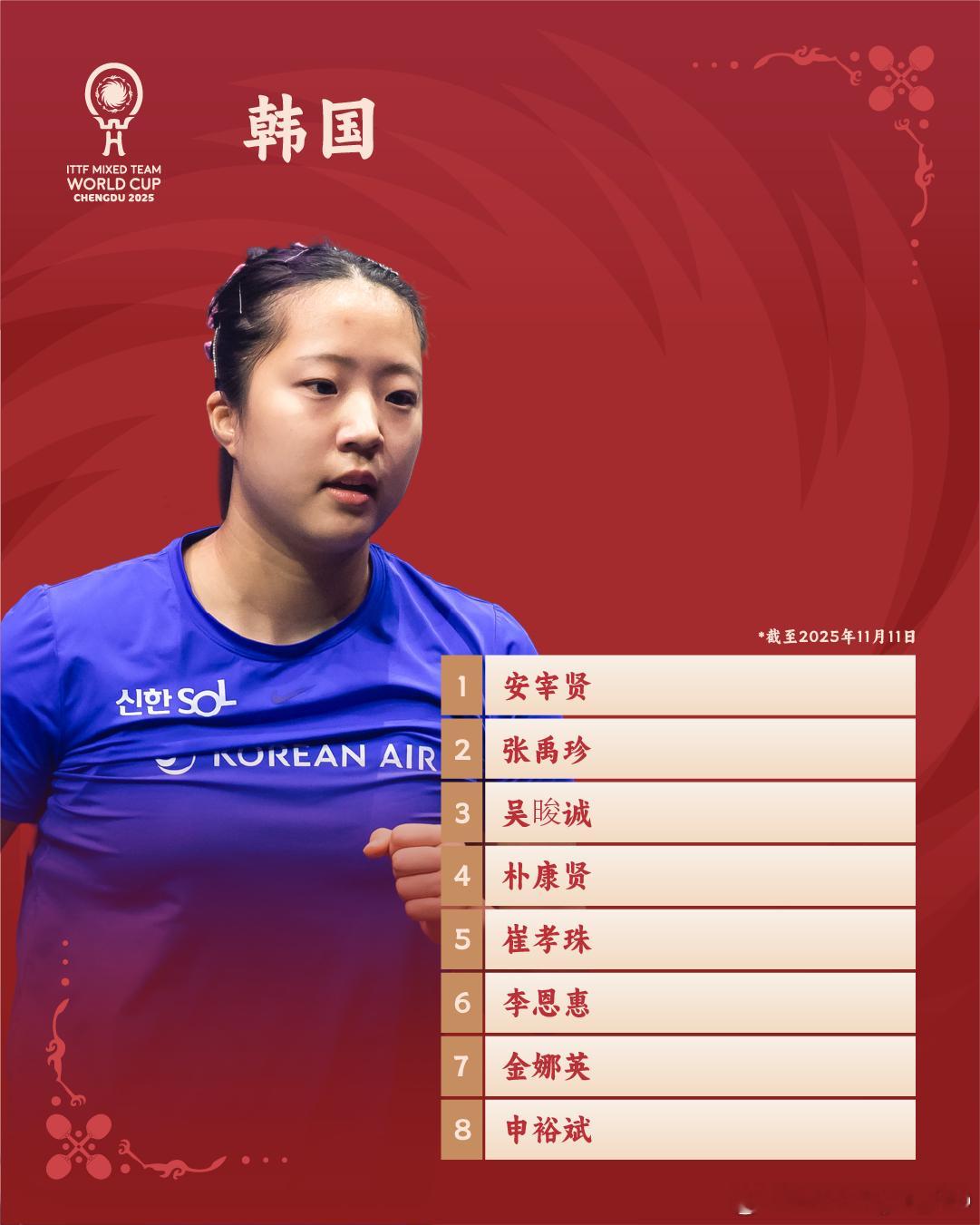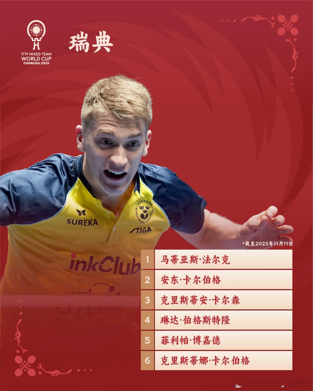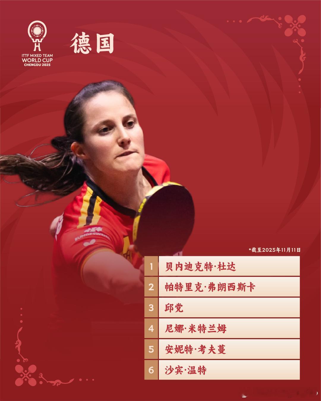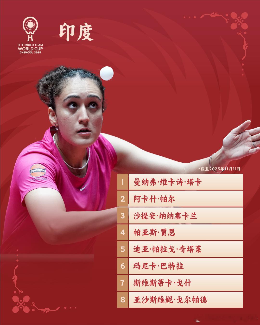 2025年成都国际乒联混合团体世界杯,将于11月30日至12月7日在中国成都举行,冠军队将获得2500点世界排名积分。国际乒联于今日正式公布参赛球员名单: 🇨🇳中国:王楚钦、林诗栋、梁靖崑、徐瑛彬、王艺迪、蒯曼、王曼昱、孙颖莎🇯🇵日本:张本智和、户上隼辅、松岛辉空、篠塚大登、早田希娜、大藤沙月、伊藤美诚、张本美和🇰🇷韩国:安宰贤、张禹珍、吴晙诚、朴康贤、崔孝珠、李恩惠、金娜英、申裕斌中国台北:林昀儒、高承睿、黄彦诚、郭冠宏、李昱谆、蔡昀恩、黄禹乔、郑怡静🇫🇷法国:艾利克斯·勒布伦、费利克斯·勒布伦、西蒙·高茨、夏洛特·卢茨、普利蒂卡·帕瓦德、袁嘉楠🇸🇪瑞典:马蒂亚斯·法尔克、安东·卡尔伯格、克里斯蒂安·卡尔森、琳达·伯格斯特隆、菲利帕·博嘉德、克里斯蒂娜·卡尔伯格🇩🇪德国:贝内迪克特·杜达、帕特里克·弗朗西斯卡、邱党、尼娜·米特兰姆、安妮特·考夫蔓、沙宾·温特🇭🇰中国香港:黄镇廷、林兆恒、陈颢桦、蔡俊杰、苏籽童、吴咏琳、朱成竹、杜凯琹🇮🇳印度:曼纳弗·维卡诗·塔卡、阿卡什·帕尔、沙提安·纳纳塞卡兰、帕亚斯·贾恩、迪亚·帕拉戈·奇塔莱、玛尼卡·巴特拉、斯维斯蒂卡·戈什、亚沙斯维妮·戈尔帕德🇪🇬埃及:奥玛·阿萨尔、约瑟夫·阿卜杜拉齐兹、巴德尔·穆斯塔法、穆罕默德·埃尔贝亚利、尤斯拉·赫尔米、法里达·巴达维、马里亚姆·阿尔霍达比、汉娜·高达🇷🇴罗马尼亚:爱德华·约内斯库、奥维杜·约内斯库、尤利安·奇里塔、达里尤斯·莫维利亚努、伊丽莎贝塔·萨马拉、伯纳黛特·斯佐科斯、安德烈娅·德拉戈曼、阿迪娜·迪亚科努🇦🇺澳大利亚:裴焕、卢伟、林文政、普西霍吉奥斯·康斯坦丁娜、吴佳牧娃、刘杨子🇨🇱智利:尼古拉斯·博格斯、古斯塔沃·戈麦斯、阿方索·奥拉夫、瓦伦蒂娜·里奥斯、丹妮拉·奥尔特加、波琳娜·维加🇧🇷巴西:费利佩·阿拉多、哈密尔顿·亚马内、卢卡斯·罗曼斯基、卡琳娜·濑长、维多利亚·斯特拉斯伯格、渡边·劳拉🇭🇷克罗地亚:托米斯拉夫·普卡、安德烈·加奇尼、伊沃·本、弗朗尼·柯吉克、莱娅·拉科瓦奇、哈娜·阿拉波维奇、马蒂娅·叶格、伊凡娜·马洛巴比克🇺🇸美国:梁吉善、希德·纳雷什、张向晶、韦德·谢思、余曼迪、塔西亚·皮亚达萨、杰西卡·雷耶斯·莱、陈伊依