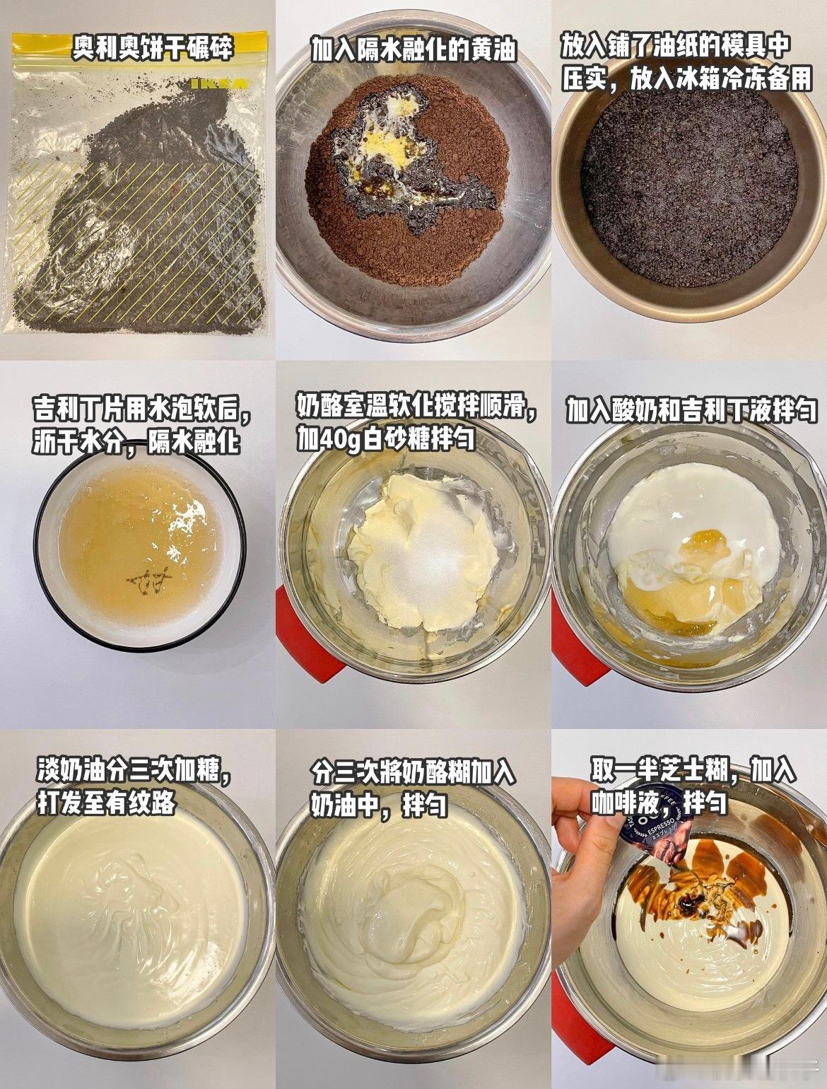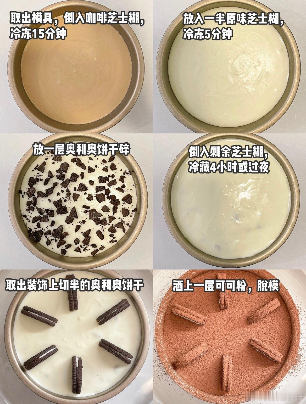 醇香的咖啡、酥甜的奥利奥、浓郁的芝士,碰撞在一起,冰凉顺滑不甜腻,入口即化,大写的好吃。zui 重要是免烤箱,搅一搅即可,简单0失败。✅食材饼干底:奥利奥饼干碎80g|黄油30g芝士糊:奶油奶酪200g、细砂糖40g、酸奶100g、吉利丁片10g、淡奶油200g、细砂糖20g、咖啡液20g、表面装饰:奥利奥饼干3块、可可粉做法1️⃣奥利奥饼干碾碎,加入融化的黄油拌匀,放入铺了油纸的模具中,放冰箱冷冻备用2️⃣吉利丁片提前泡软后隔水融化3️⃣奶油奶酪室温软化,搅拌至顺滑,加入40g细砂糖拌匀,加入酸奶、吉利丁液搅拌顺滑4️⃣淡奶油加20g细砂糖打发至有纹路,分三次加入奶酪糊拌匀5️⃣取一半芝士糊,加入咖啡液拌匀6️⃣咖啡芝士糊倒入模具中冷冻15分钟7️⃣取出模具倒入一半原味芝士糊,冷冻5分钟后,放入一层奥利奥碎,再倒入剩余芝士糊。8️⃣放入冰箱冷藏4小时或过夜,取出放切半的奥利奥饼干,撒上可可粉,用热毛巾捂一下就可以脱模了。香甜丝滑细腻,这一口下去上班的烦恼都抛之脑后了