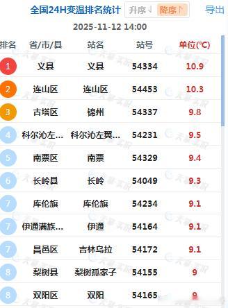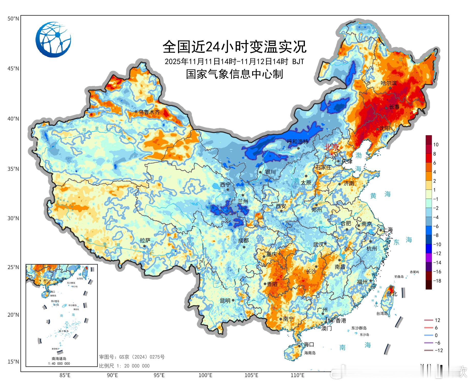 【气温】今天内蒙古和东北一带,为气温变化最显著的区域。内蒙古东南部和东北大部处于冷锋前部,低空偏南风的暖平流输送,大多出现4-10℃升温,辽宁义县升10.9℃,为14时全国升温最强站点。沈阳截至14时最高气温16.8℃,11月中旬少见的温暖。而在冷锋后部,内蒙古大部地区气温在西北风冷平流影响下,大多出现4-8℃降温,内蒙古西乌珠穆沁旗降8.9℃,为14时全国降温最强站点。
