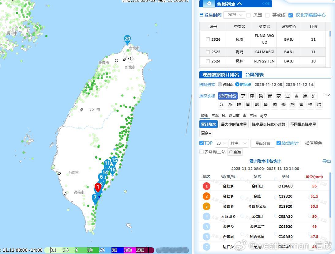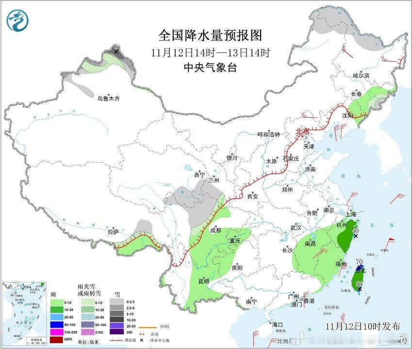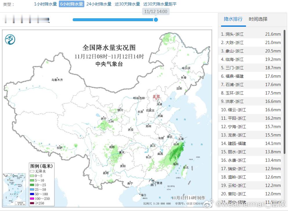 【降水】 今天08-14时,台湾、福建、浙江一带,在台风凤凰和冷空气影响下,出现较强降雨。台湾宜兰县降雨减弱,台东县的金峰乡一带,降雨最强,金针山6小时雨量56毫米,排名第一。浙江洞头21.6毫米、福建福鼎17.6毫米,为各自省份6小时降雨最强站点。今天下午到明天中午,东南沿海一带的降雨持续,浙江东部、台湾岛北部和南部将有大到暴雨(50-70毫米)。此外,明天新疆北部的降雪开始增多,阿勒泰北部一带,可能有中到大雪。