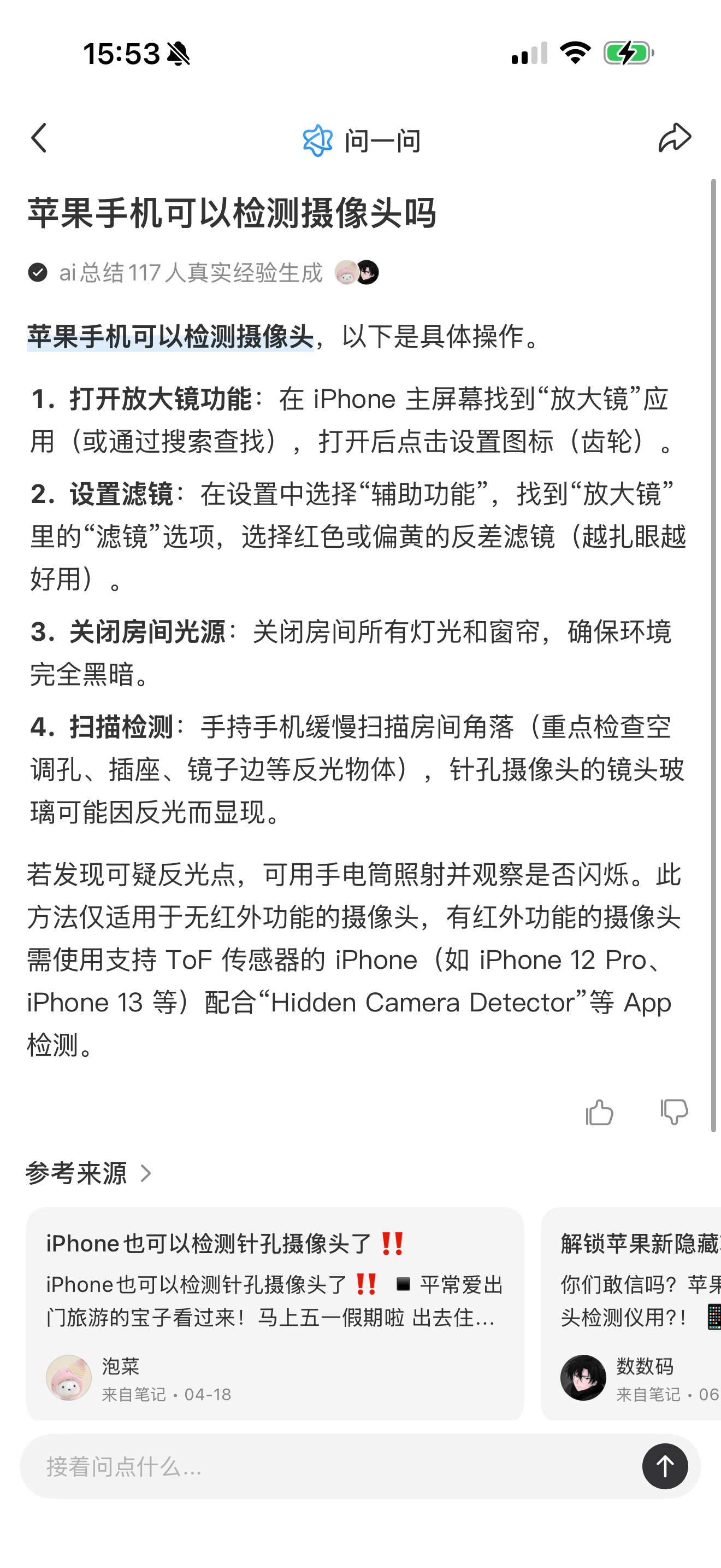 iPhone可以检测针孔摄像头,iPhone你小子总算是有了个实用的功能,以后住酒店再也不用拿手机瞎晃悠当侦探了,直接让iPhone上岗之前还刷到过一个王者荣耀测室内有没有摄像头的帖子,以后住酒店结合着用。